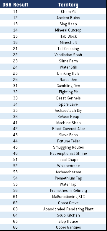 When generating a new territory, roll on the Lost Zone Territory Table. If a duplicate territory is rolled, do not re-roll it. There are a lot of Slag Heaps in the Underhive, after all.