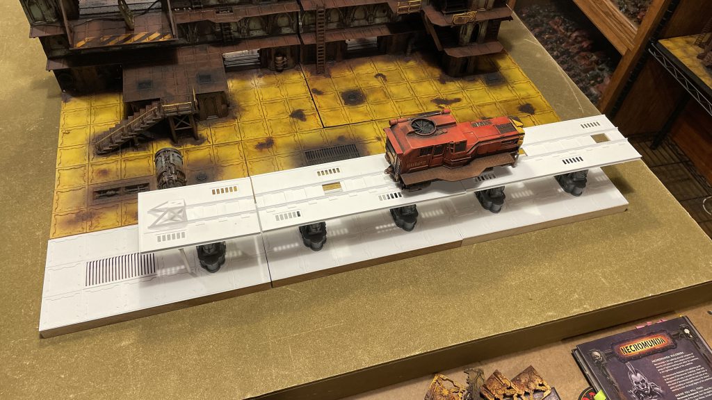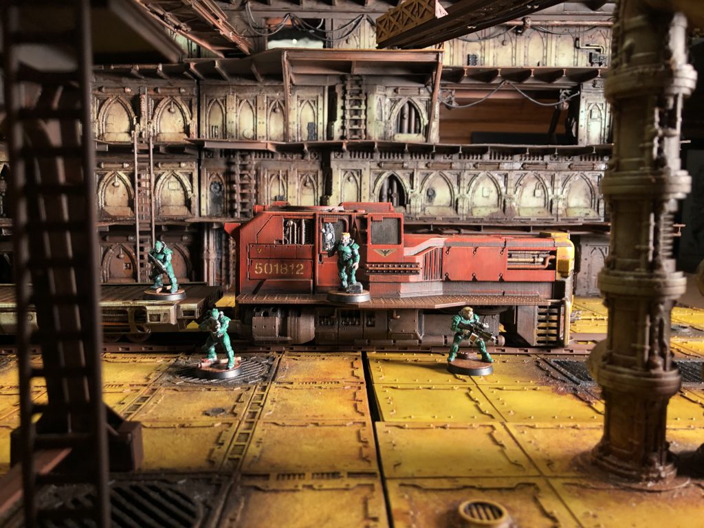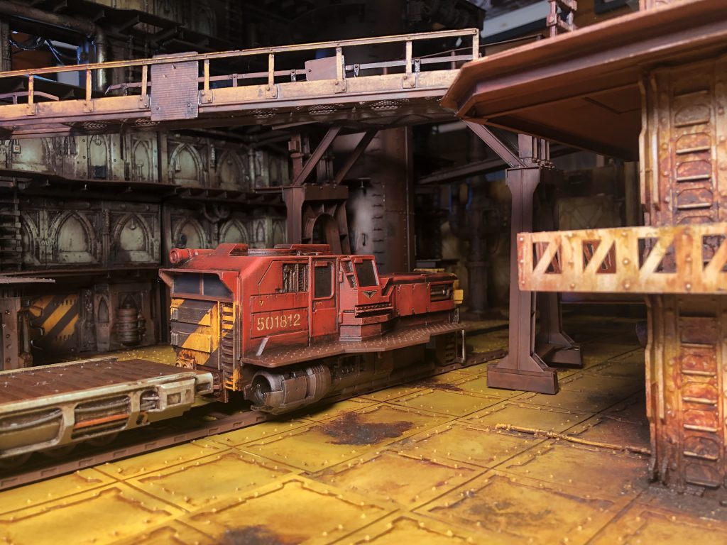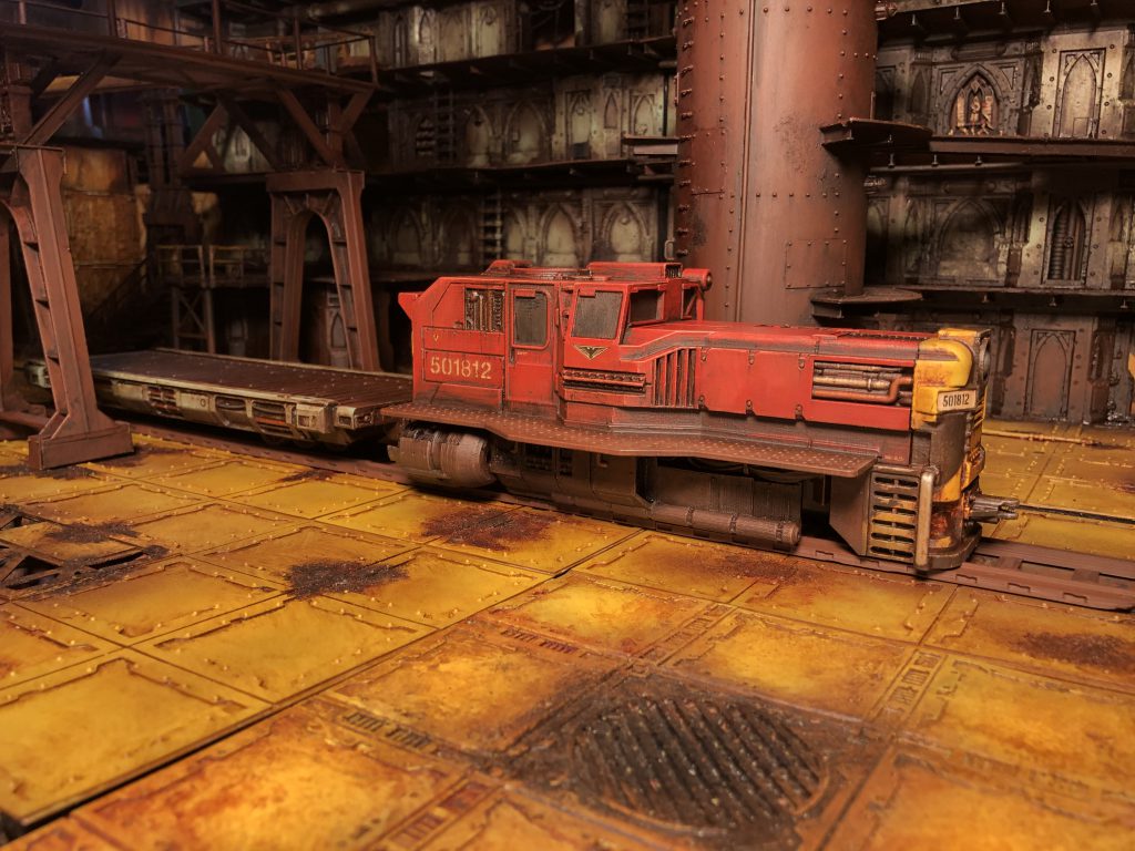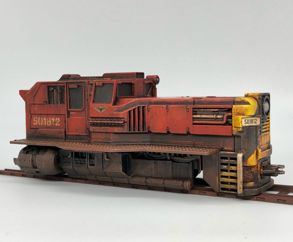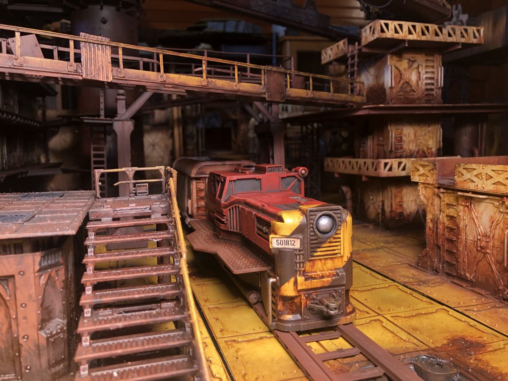 Back in 2020 I had the chance to consult with Imperial Terrain, a small company specializing in 3D printed terrain mostly focused on Star Wars: Legion terrain. They were working on a train, and wanted to broaden the offering; making an option that would feel at home in the underhive. After some initial conversations, I consulted with them on the design. I pulled real-world train examples for gubbins I thought would mesh well with the design they’d made. We ended up with versions that looked super cool for Legion and Necromunda. They sent me a set to paint up and I treated it like the rest of my terrain. I dug into my stash of decals and found lots of different things to make it feel like the train really belonged in the underhive.