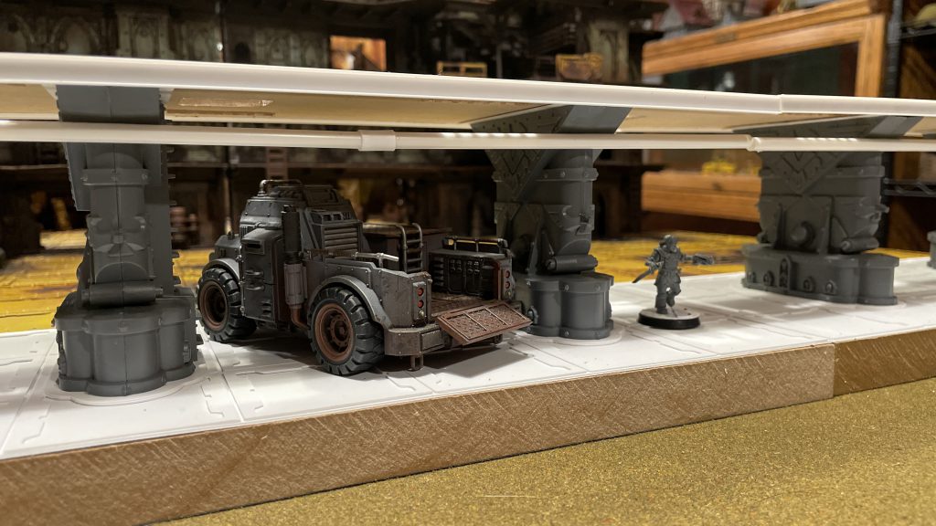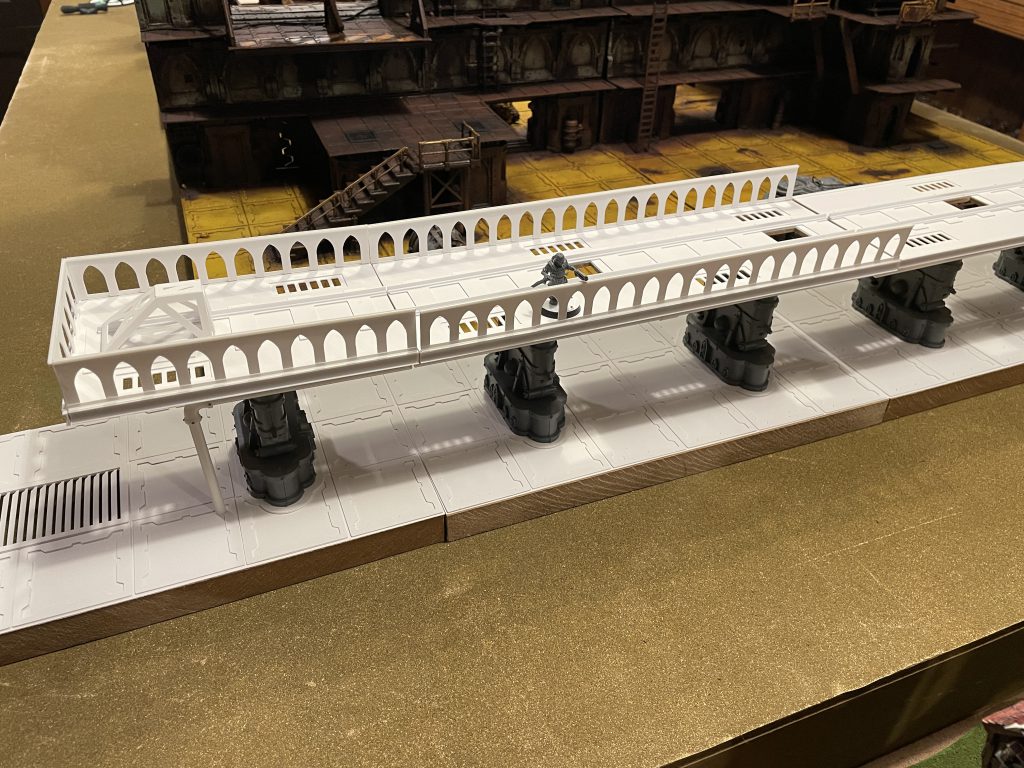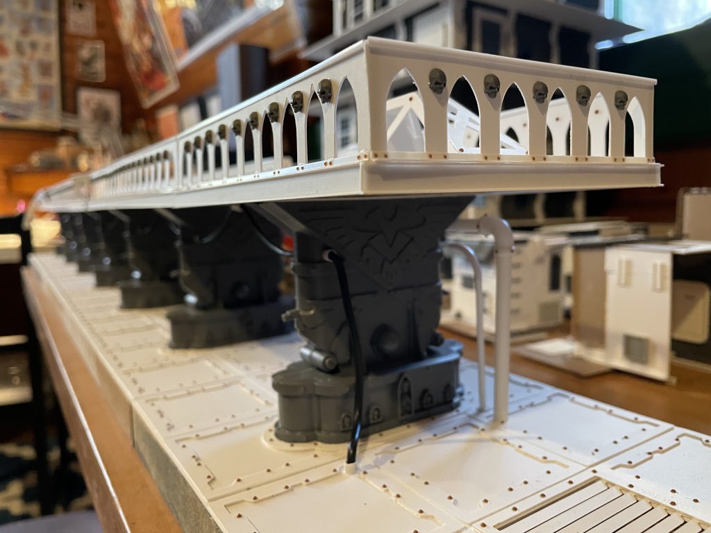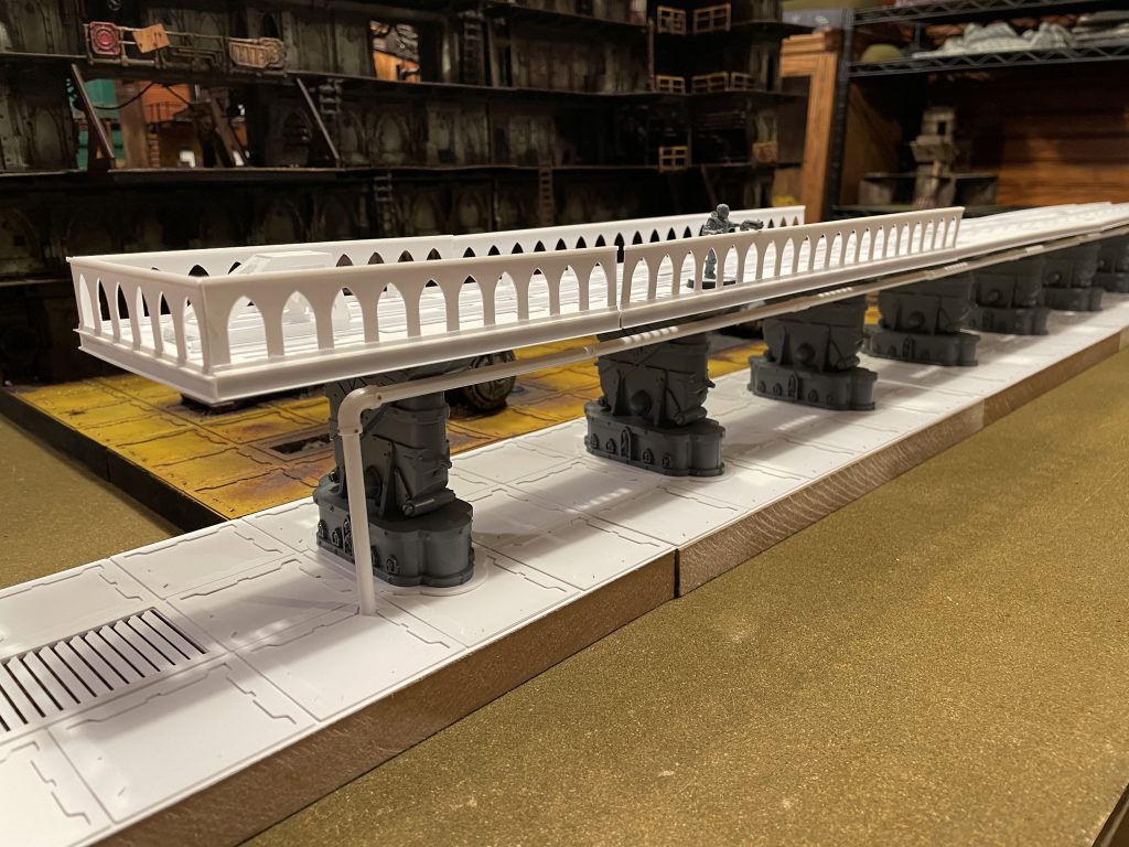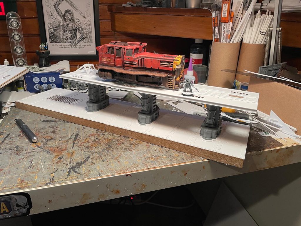 I had a lot of fun bringing it to life, and always intended to make train tracks to go with it. Fast-forward to now and I picked up a giant lot of new-on-sprue terrain. Included were the legs from two Aquila landing pad kits. As soon as I saw them an idea formed and I started sketching out an elevated train track.