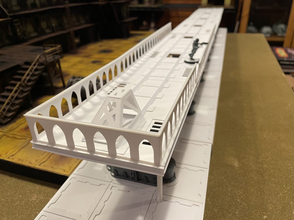 Inspired somewhat by the art from Inquisitor, I drew up and cut some gothic railings, and used small I-beams to finish and mount them.