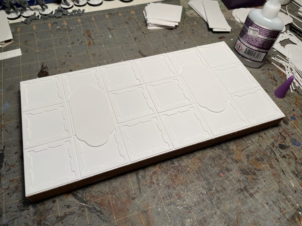 After that, it’s hours of cutting time and then I can pop out and clean up the parts. After that, assembly, layering styrene onto my MDF bases (cut on a day that wasn’t 10º). One pro to cutting my own floor tiles is that I can make buildings truly feel like they're built into the terrain; cutting the bases and layered detail directly into the floors.