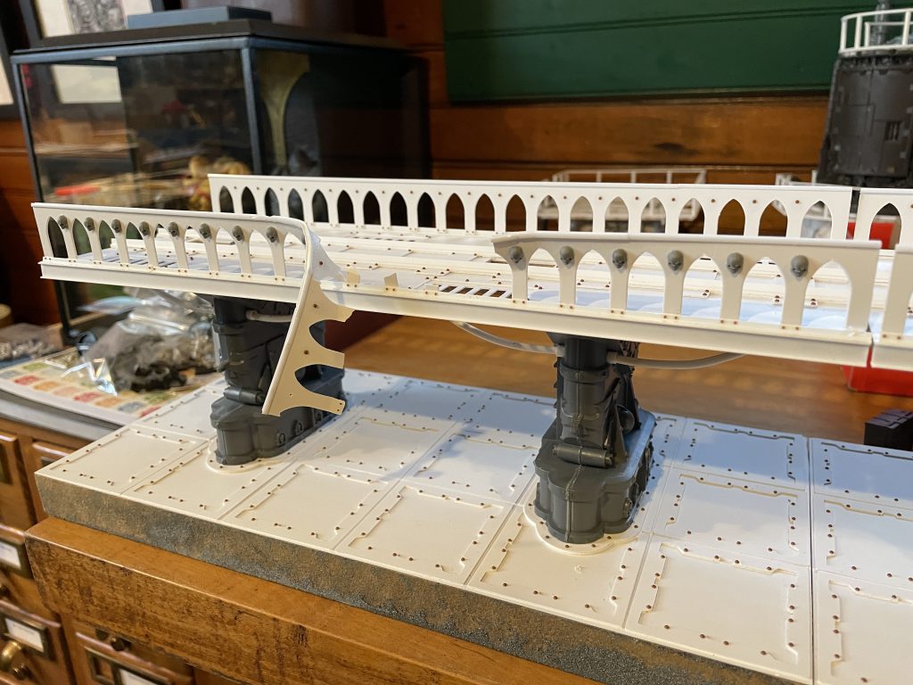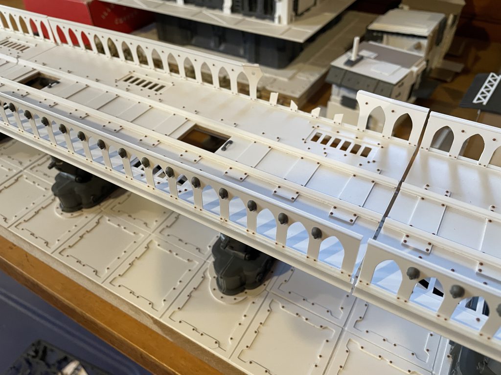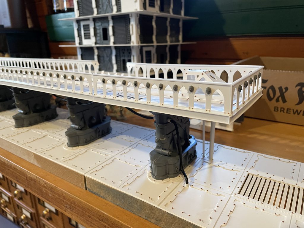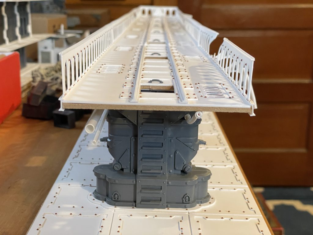 I riveted the floors to match the rest of my terrain, and applied them to the bridge sections as seemed right. I knew I needed them on the bottom of the railings, but that was a tedious process. I also added some hand grabs from the Leman Russ kit to the tops of the ladders to add an artifact of use.