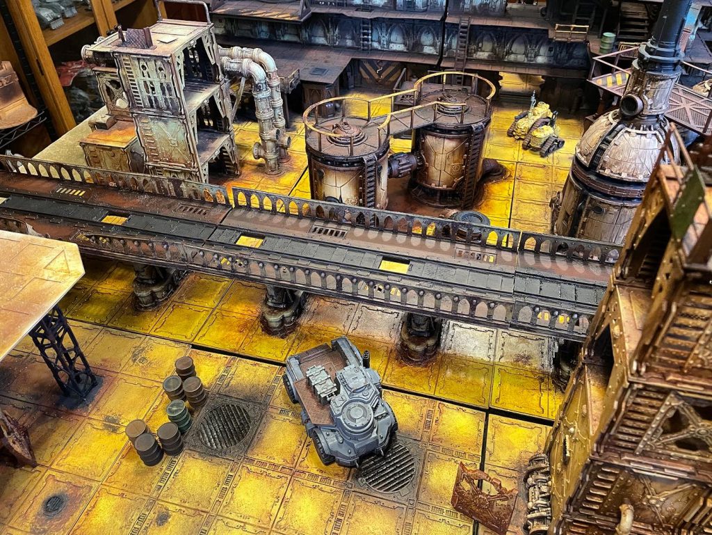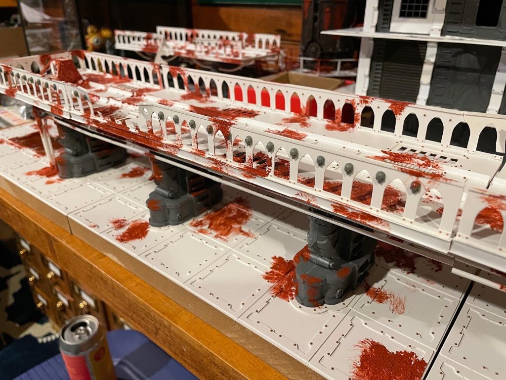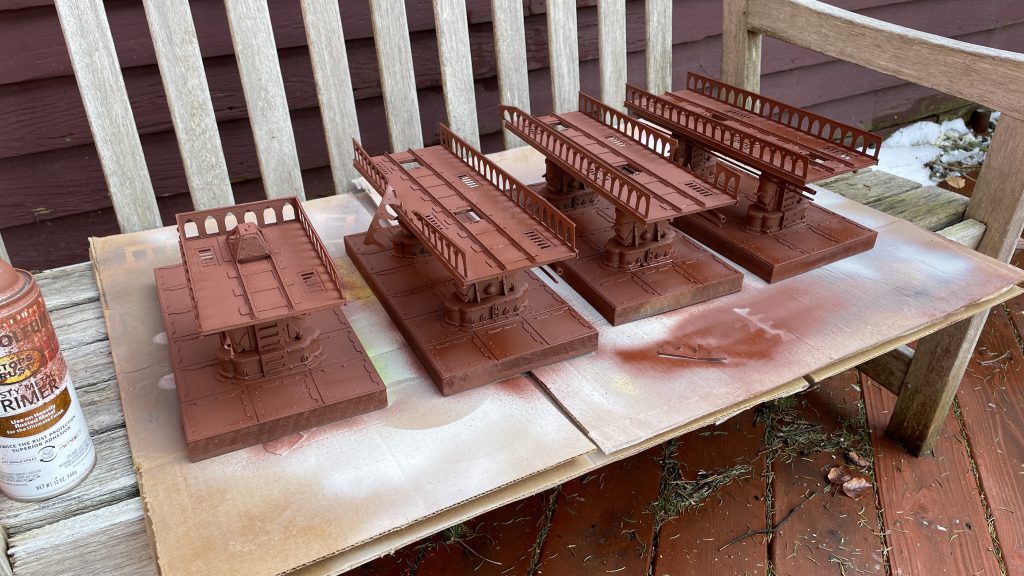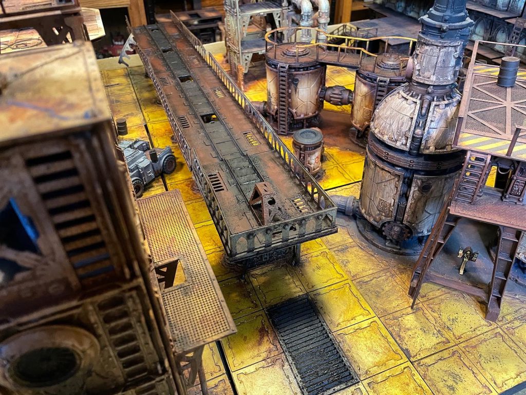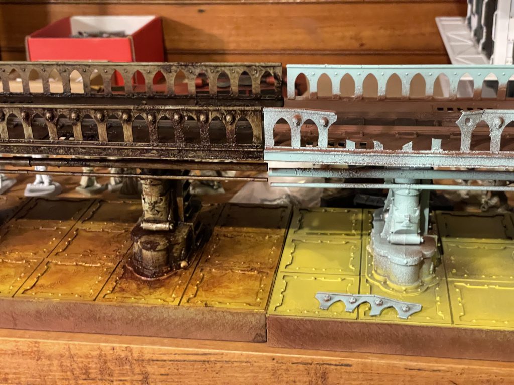 After that's cured overnight I add my color. I use Army Painter sprays for this, using tape and ripped chunks of cardboard to mask and control where the color goes. I use the AP yellow spray for the floors and for these, Montana Gold Malachite Light for the train bridges. I add some Rustoleum Camo dark brown for darker areas of rust.