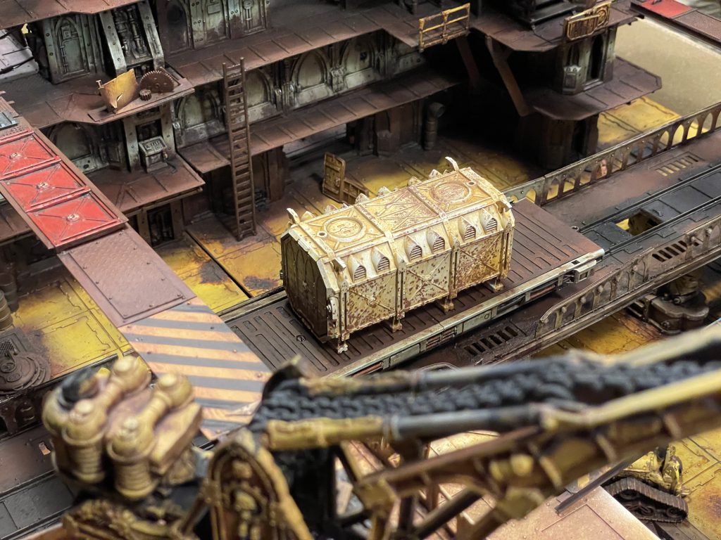 After the basic structure was together, I got down to building the control cab and adding details. Railings, ladders, gantries, pipes, cables, and the ever-present rivets. I even bent wire into loops suspended on chains that can hold a Munitorum container.