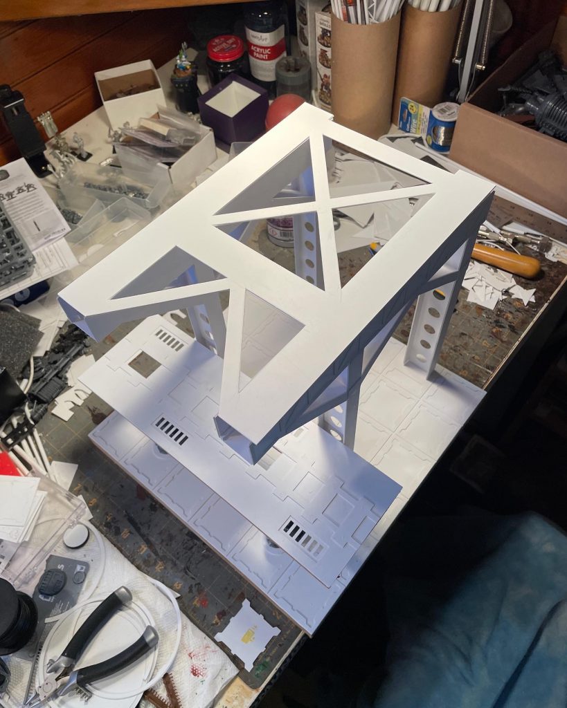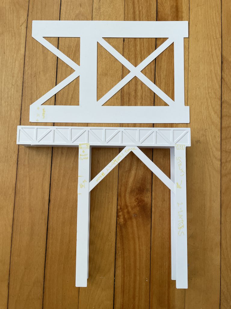 Well..... thanks to one of my Patreons, I was given the request for a crane to go with the train bridges. I had a reference to work from but after several false starts, I came up with a design that meshed with the rest of my terrain. I used references of cargo container cranes for the shape of it and after a test cut and some tweaks, got the basic structure together. It was a balance to get it to fit on a single 12x12 inch tile and not be too tall to store while still being able to fit the train under the crane arm.
