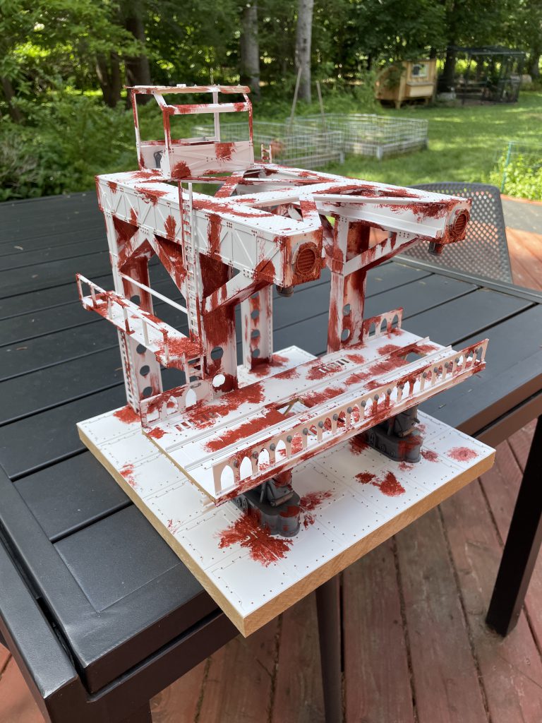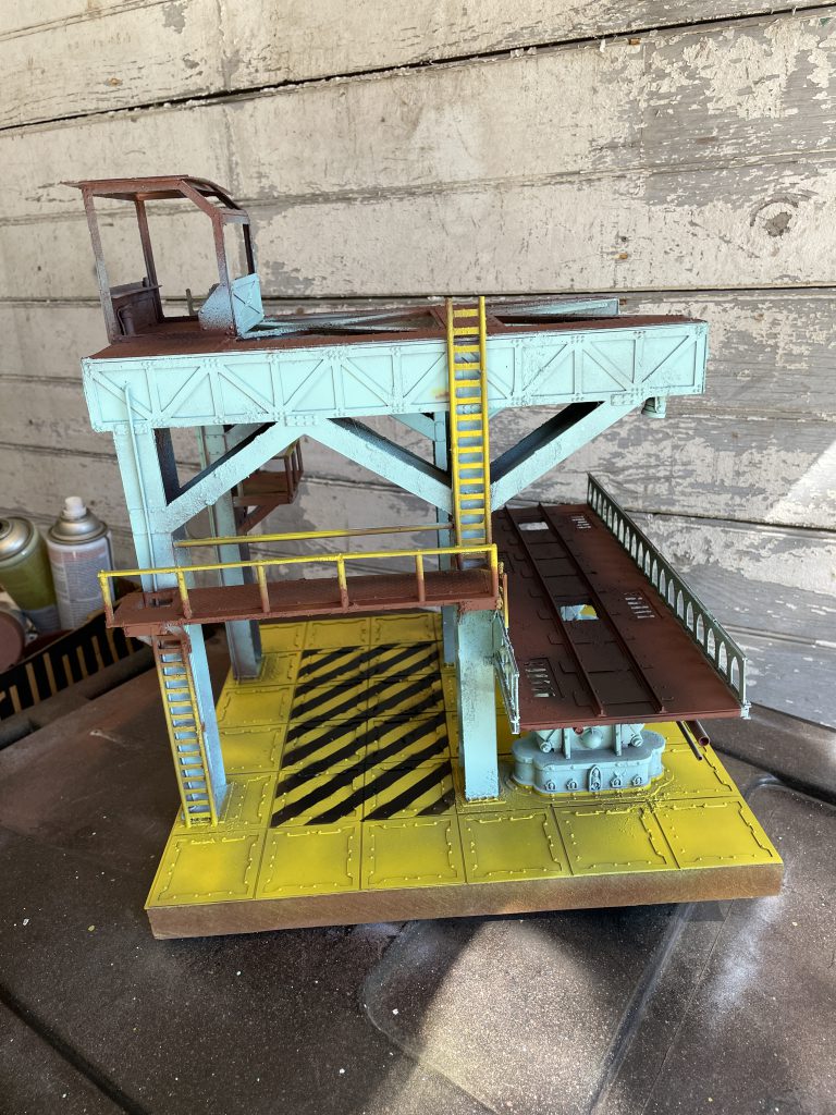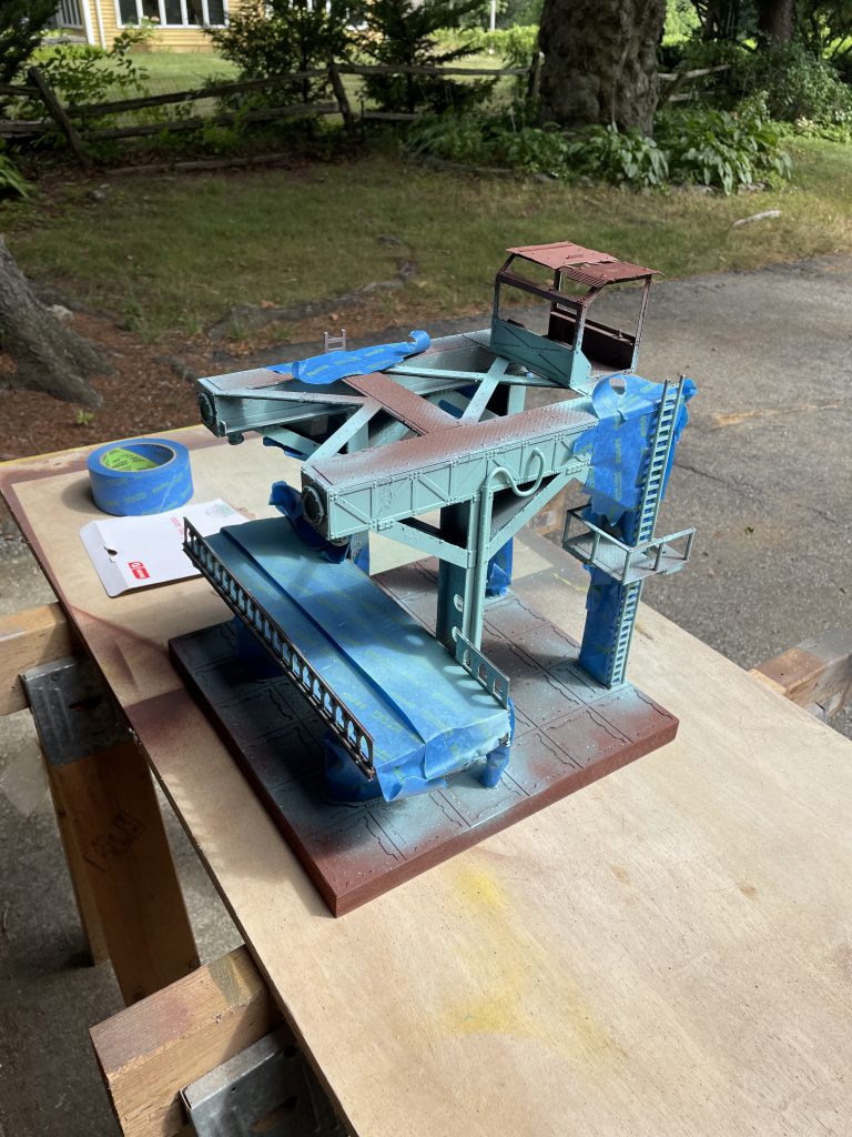 After that, I added my usual texture and went at it with the same color scheme I mentioned earlier in this article. I sprayed the teal first and spent considerable time masking off the crane and bridge supports before I sprayed the floor. Despite this, there was still a little clean up to do, especially on the platforms before the railings.