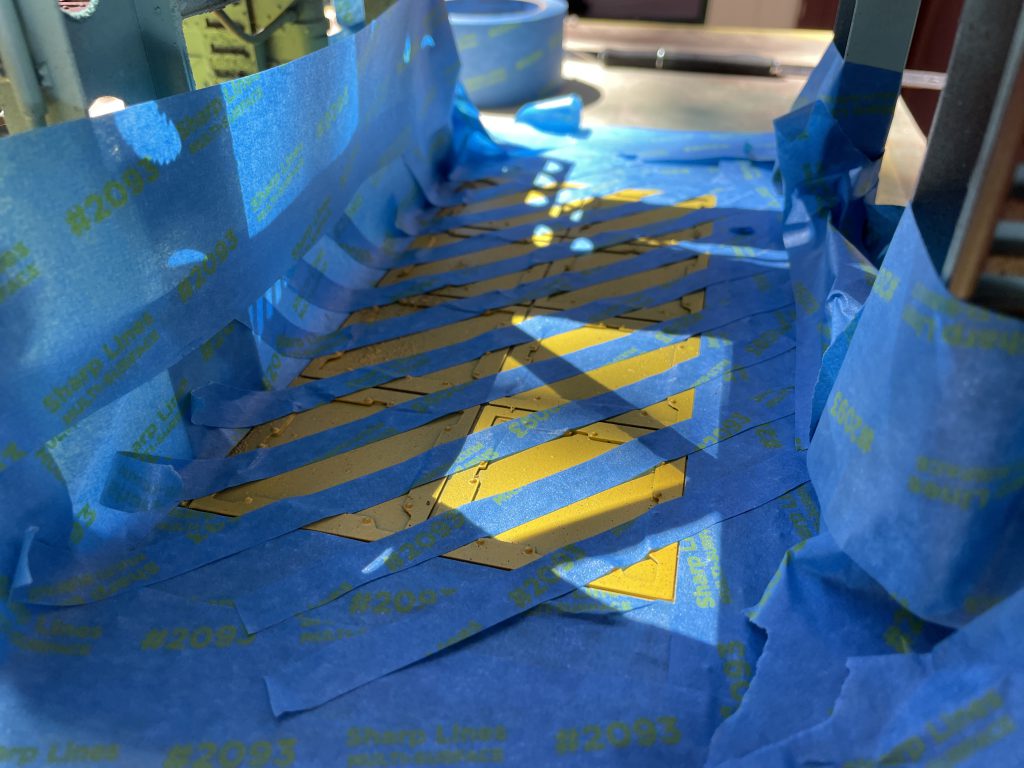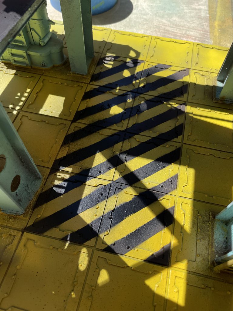 With all the color on, I spent time masking off an area of the floor for hazard stripes. I masked off the area first and then cut down masking tape into 1cm strips leaving the ends connected. This allowed me to lay down 3-4 strips at a time. Once I'd covered the entire area, I pulled up every other strip. Putting them all down allowed them to stay (mostly) parallel as I applied them.