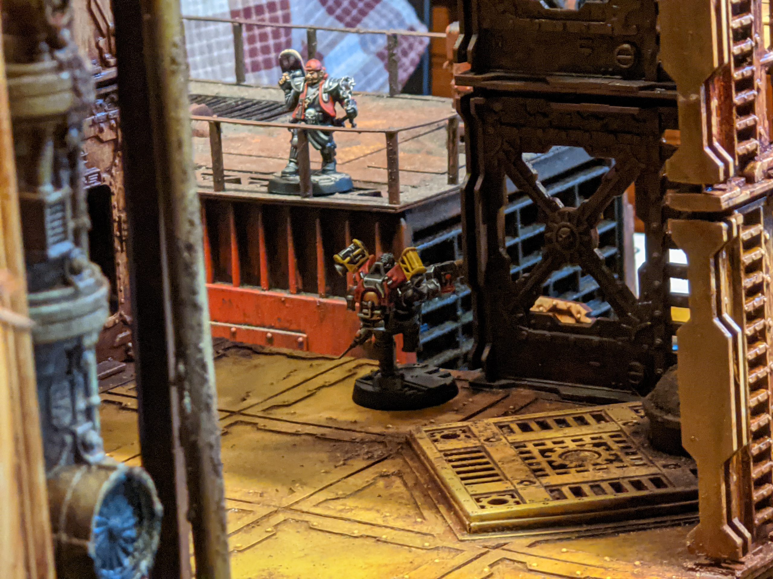 Dan: The Orlock mirror match was hilarious. The Archies and the Manwolfs were clearly upset that another Orlock gang had shown up to throw down, and they expressed their rage by sprinting directly at one another and unleashing as many bullets as humanly possible! Highlights include my hand flamer wrecker blasting across the board (and several vertical levels!) to flame some manwolfs, only to immediately eat shredder ammo. Fowler’s wrecker, Gutter, failing to use his jump pack for two turns in a row, and the aforementioned similarly-armed leader faceoff, which I only won because I happened to be the one who charged!