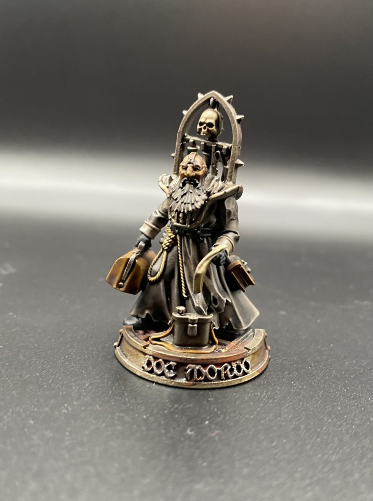 I also converted up a Rogue Doc to fit the aesthetic of the gang but still stand out, using a redemptionist body and head and arms from the newer plastic Krieg sprue for medical bag and arms with cuffs at the end of the sleeves. I painted it up differently from my gang so he stood out and named him Doc Mordo.