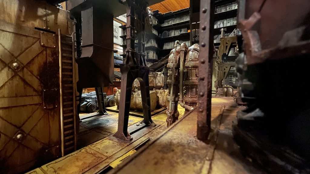 It changes the game immensely. Because of the height, you're forced to think about the 3rd dimension in a way that games of Zone Mortalis and even other Sector Mechanicus boards don't. We were lucky to get a handful of games on them before COVID forced everyone into isolation. We found that having the ability to traverse the space between terrain pieces made the games more fun, but caused players to have to make big choices. Running along the walls or across gantries, you find yourself out in the open in many cases, but there's still many times where intervening terrain gives you cover that you wouldn't expect. Terrain that would have previously been the top of the stack and you'd look down upon everything else, you find that you're hiding on one side of it, using that height as cover from the even higher walls. I've found that our games began to happen in two places. You'd have one group of gangers duking it out on the top level, running across gantries and the top levels of the terrain, blasting at each other until enough of the enemy fell off to gain control. The other group would be on floor level, flitting from cover to cover in the shadows cast by the gantries above. Hilariously, I have a pair of large tweezers (approx. 10" long) that we've had to use to extricate the occasional ganger who is too deep in cover.