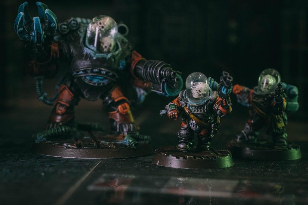 Game 4 (vs Van Saar, Van Saar and, uh, Van Saar): Chris, myself, my friend Tom (who introduced me to Necromunda) and a nice young chap called Ben kicked off on Sunday with that most thrilling of shoot0outs: a four-way Van Saar game. Thankfully, visual distinction wasn’t a problem: Chris’s action-posed Van Saar are sleek and dynamic, Ben’s had cyberpunk flare with flashes of neon, Tom’s are a lovingly-converted and painted, Tzeentch-y, spider-y batch, while mine were, well, squats.