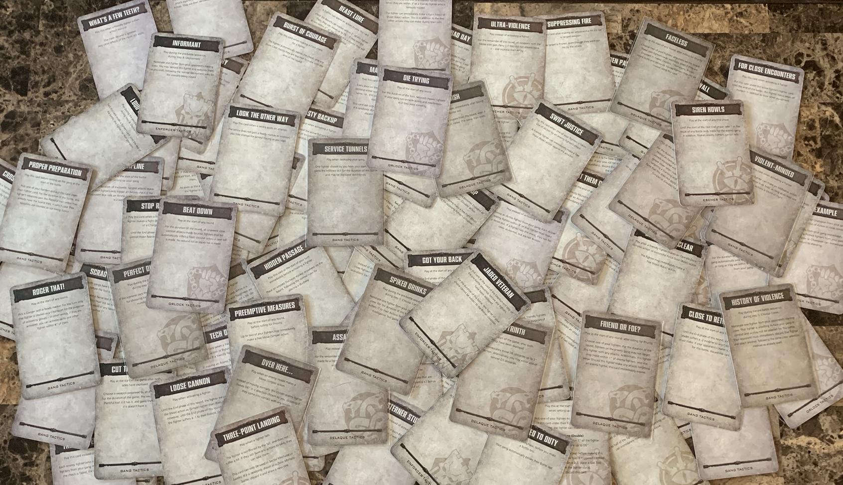 - Acquired all of the gang and gang vehicle-related card packs, which each included both gang-exclusive Tactics Cards as well as universal cards usable by any house/cult, as well as the Underdog Card Pack (which also included a dozen universal cards).