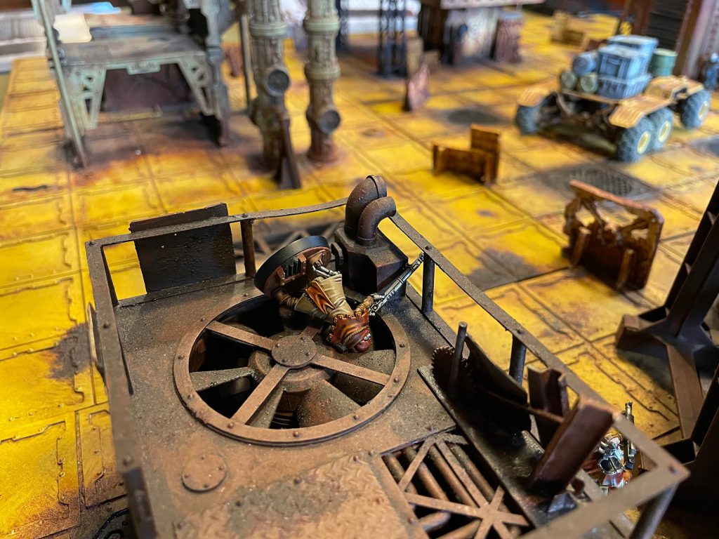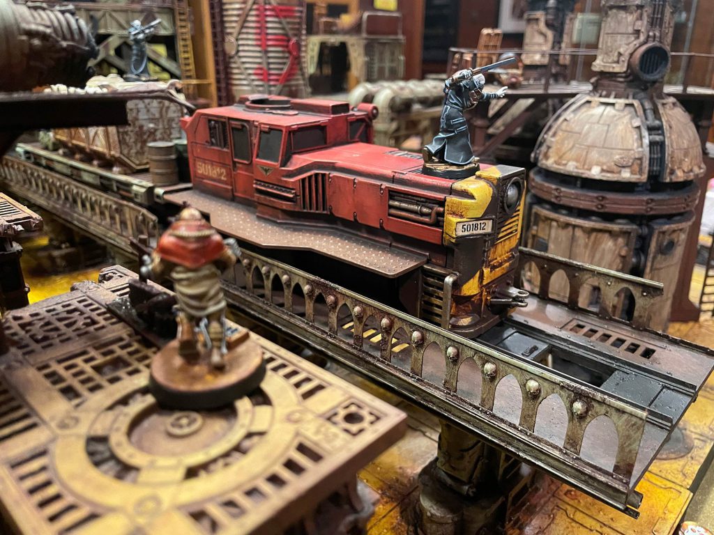 The game ended up coming down to the last turn when I was finally able to destroy the train with my Specialist with Long Rifle taking the last HP off. My ganger with Heavy Crossbow, while doing the initial damage to the train, spent the rest of the game getting shot, pinned, knocked back and rolling a 6 for his armor save, just to stand up and have the experience repeated.