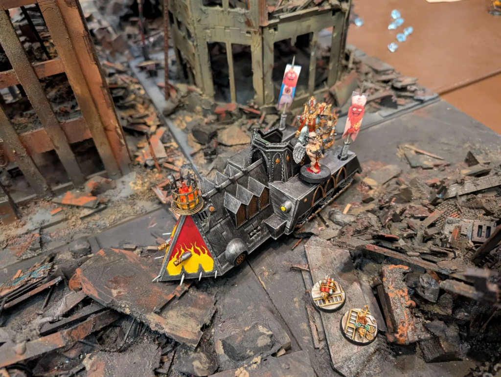 For Game 1 everyone did a simple Gang Fight with the Shards on the board. This gave everyone a chance to remember how to play Necromunda, enjoy the vibes of the game, and gave me a chance to print off the missions and answer questions. Games 2 through 5 used the missions that were fixed to each table, and for Game 6 I gave everyone two options. Option 1 was that people could do one last game using fixed missions, or Option 2 was that I would run a Convoy Attack where everyone would fight off the Murder Hornets as they stood atop a full Land Train worth roughly 3000 credits. I made it very, very clear that Option 2 would be a complete clusterfuck.