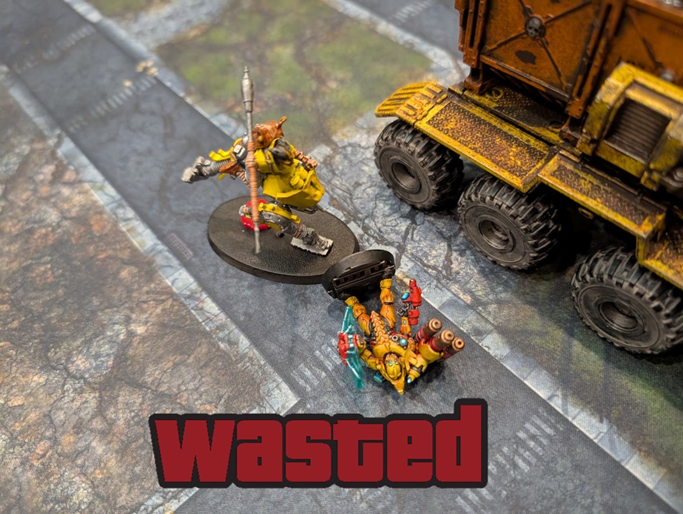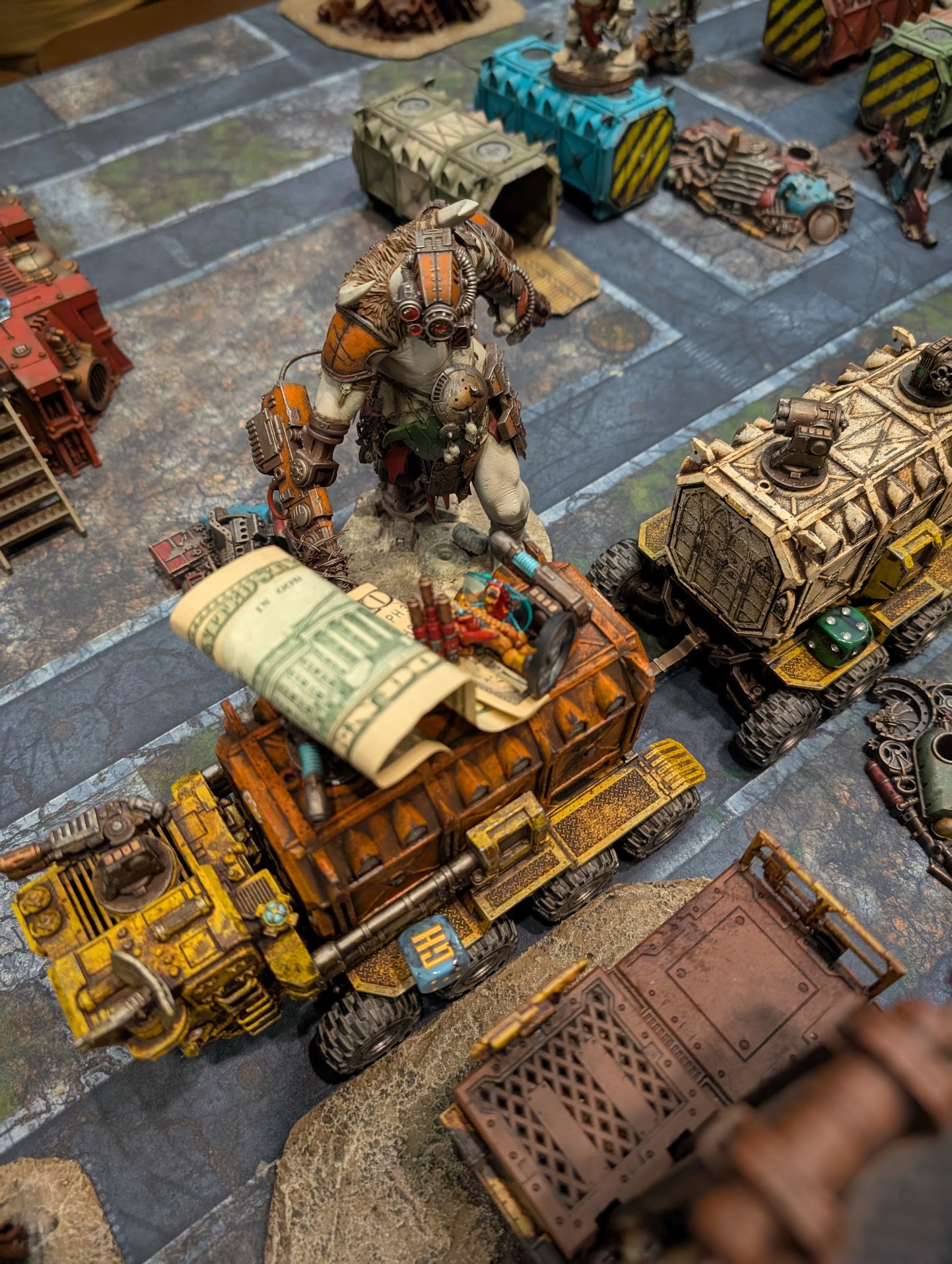 Necromunda. The only game where people will hate a model so much they will offer real money to see it dead. And yes, that's a horrifying cyber-monstrosity attempting to ram the Land Train to claim the bounty. Matt (@hivemarketminis on Instagram) did an amazing job and took best painted. Credit: Kevin Genson
