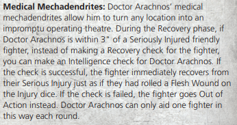 Gear comparison: At twice the cost of a standard Rogue Doc, you’d hope that Doctor Arachnos came with some cool stuff. Well, sort of. A Rogue Doc comes with a laspistol or stub gun and a medicae kit. Arachnos leaves the medicae kit at home, and instead brings along a bio-scanner, mesh armor, and a respirator. You might think that not having the medicare kit stinks, but we’ll explain why it doesn’t when we talk about his special rules. Otherwise, Arachnos comes with mostly useful defensive equipment that will help him stay alive to keep patching up those gangers. Finally, Arachnos comes with a unique close combat weapon: medical mechadendrites, which are actually quite good! 3” Versatile is always useful, and the weapon has both a +1 to hit in short range (ie. base-to-base), and the Toxin trait, making Arachnos a threat to multi-wound models. Overall, Arachnos’ gear can be considered a significant upgrade over his Rogue Doc counterparts.