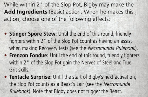 If he’s within 2” of his slop pot, Bigby is able to buff his friends or potentially tie up gangers with his culinary skills. Stinger Spore Stew functions as an emergency field medic ability, giving his nearby allies an assist in their recovery rolls. Frenzon Fondue is the most interesting of his recipes, giving a 2” bubble of True Grit and Nerves of Steel. Ignoring pinning and improving injury rolls has some serious potential - stick Bigby with your fire support for some extra survivability. Tentacle Surprise functions as an “oh shit” button or threat deterrent. Beast Lairs are swingy, but they can absolutely mess your day up.