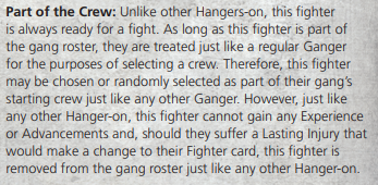 That’s where named Hangers-On come in. Similar to Dramatis Personae, AKA named Bounty Hunters, the name Hangers-on represent specific characters that reside in the Underhive. They’re hired the same way hangers-on are hired: a one-time fee secures their services until they leave or get released. Where regular hangers-on are generally unwanted when it comes to combat, our three (so far!) named Hangers-on are not only useful on the battlefield, but you may even prefer their presence to one of your regular gangers! They all also have the following special rule, making it so you can use them in any battle, unlike regular hangers-on:
