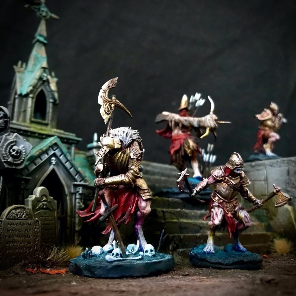 To start with you'll need miniatures, a 16in x 16in board, some D10's and tokens to represent dropped mana and objectives. For models anything vaguely dead/undead will do. This is where my inner kitbasher activates and begins planning out all kinds of fun conversions. I have also been going back through my collection of Death/Vampire Counts/Undead to see what kind of Gatherings I can come up with. Another great avenue for putting together a Gathering would be Underworlds Warbands. The Ossiarch Bonereapers Kainan's Reapers, necromancer with zombies of the Exiled Dead, nighthaunt Thorns of the Briar Queen, the skeletons of Sepulchral Guard (and the upcoming Sons of Velmorn from Gnarlwood!) would be more than enough for building an interesting Gathering. Oathmark Skeleton Infantry by North Star Military Figures is another good jumping in point, a sprue of five skeletons goes for around $10 on Ebay. For those of you with 3d printers or access to one Bestiarum Miniatures has a collection called Deadmire that is spot on for the mood of this game.