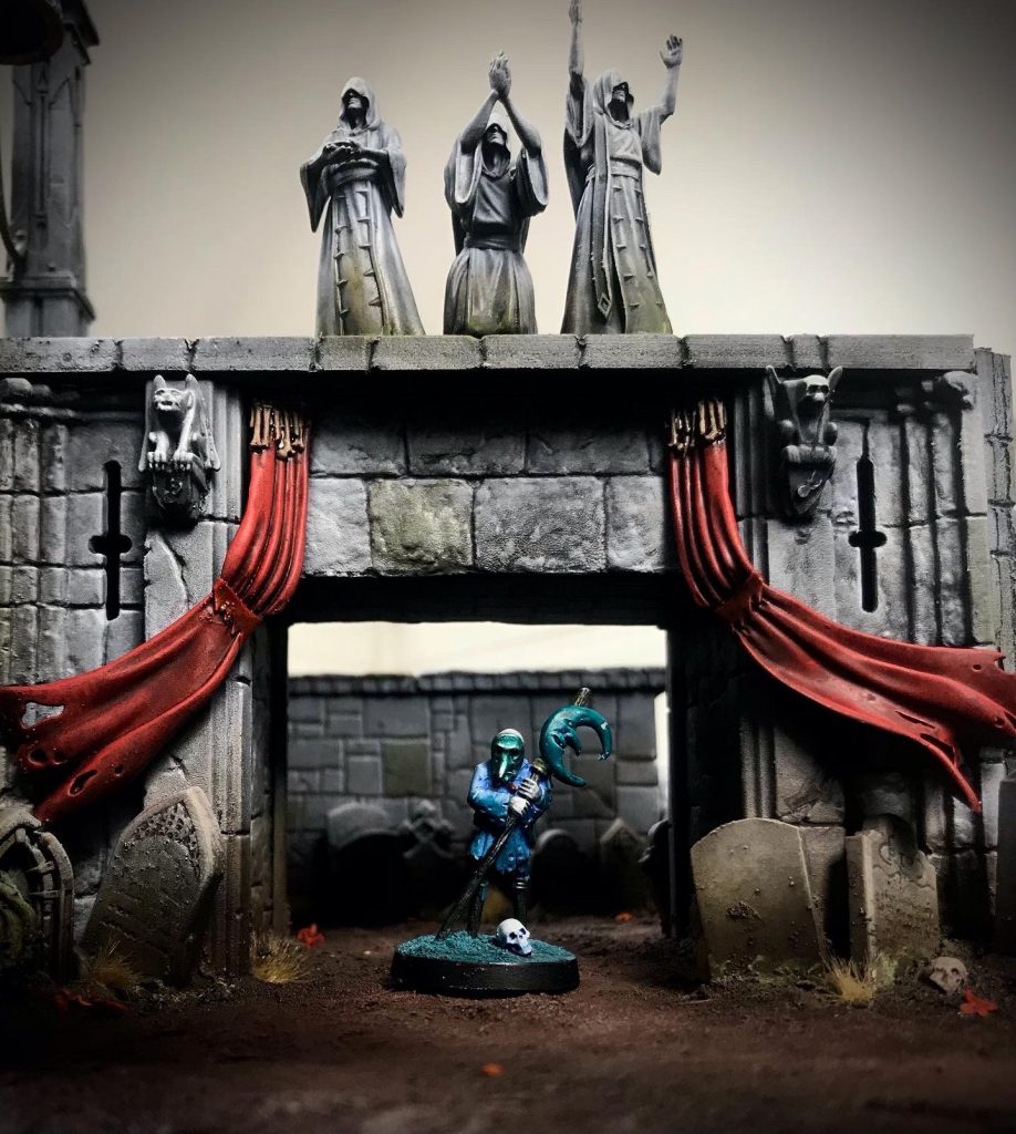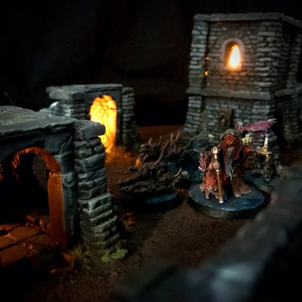 Creating a board can also be as simple or involved as you like. Owlshield has said that building small terrain boards was a motivating factor in creating the game, and the intention is to create a small diorama for Gatherings to clash on. Some walls, pillars and scatter terrain is enough to get you started. Warcry terrain would also be a good fit, and provide some more verticality to the gaming space. The Sigmarite Mausoleum kit has more than enough elements to fill out this size board.