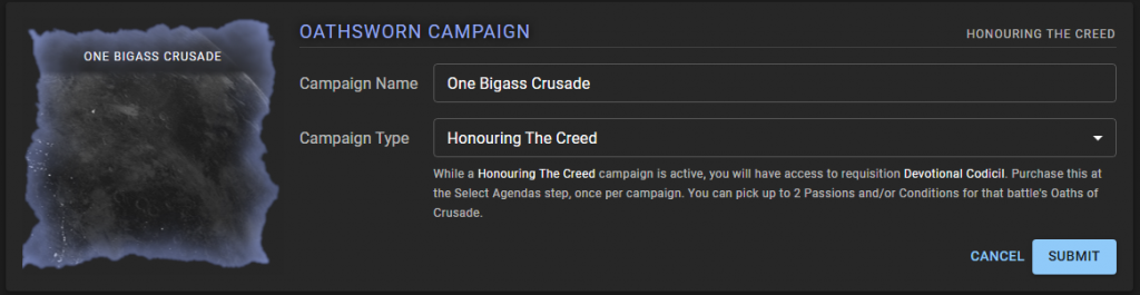Finally we've also implemented Oathsworn Campaigns for Black Templars. Once you've enabled the Space Marines add-on, you can enable the add-ons for Codex Supplements like Black Templars by going to your roster dashboard and finding the Oathsworn widget, then clicking on the little hamburger menu on the upper right. That's where you can enable Black Templars and start embarking on a quest to Honour the Creed.