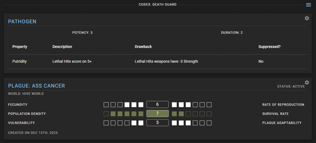 We've also added support for Codex: Death Guard. You can now create your own plague and planet to infect, tracking progress across several different key factors and tracking your Pathogen.