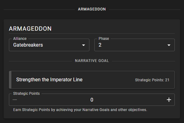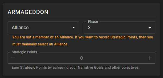 We've been building out the missing features for our Armageddon support and we're happy to say that is now fully live, so you can add players to alliances (or they can join those themselves), and have them start accruing Strategic Points from games. When reporting a game for Armageddon you'll now get a widget on the Battle Report which lets you record how many Strategic Points you've earned for your Alliance and Phase.