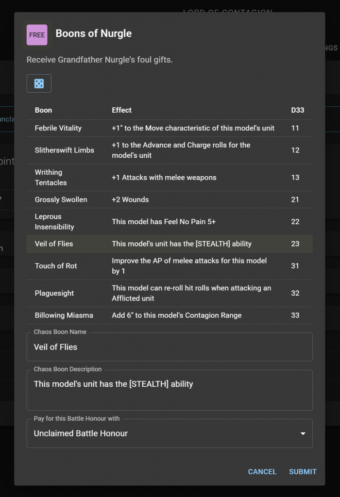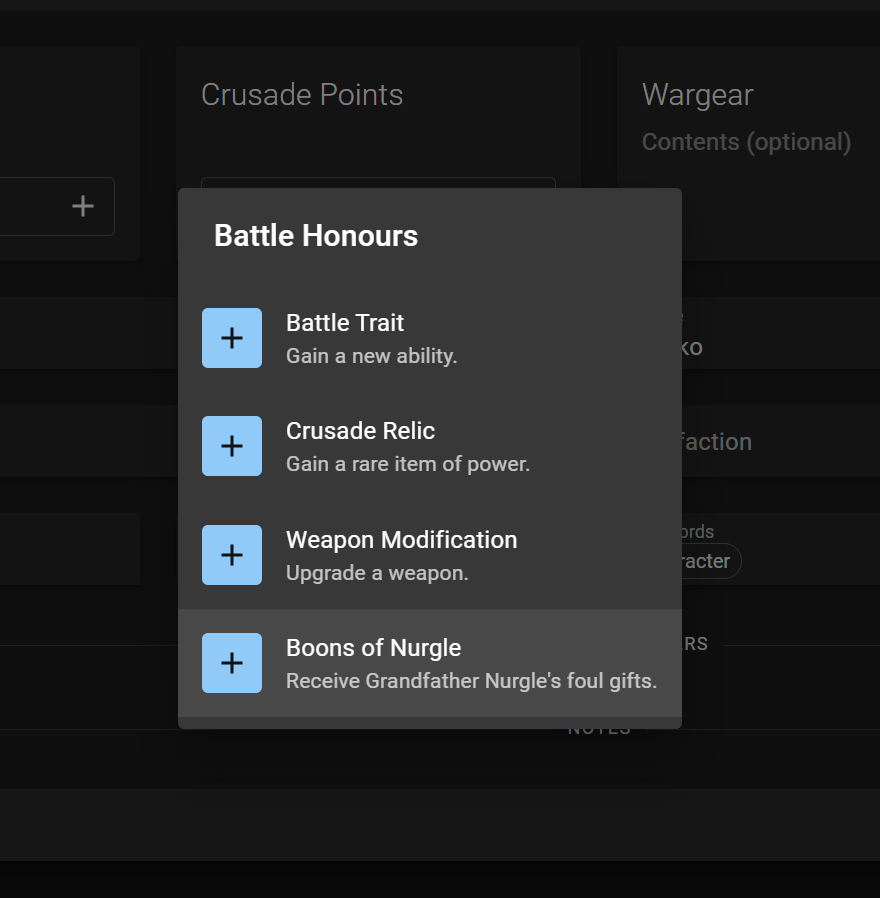 We've gone back and added support for Chaos Boons for every faction that has them - Chaos Space Marines, Death Guard, Thousand Sons, Emperor's Children, and World Eaters. If you have one of those add-ons enabled for your roster, you'll now see Boons as an option when you assign a Battle Honour to your unit.