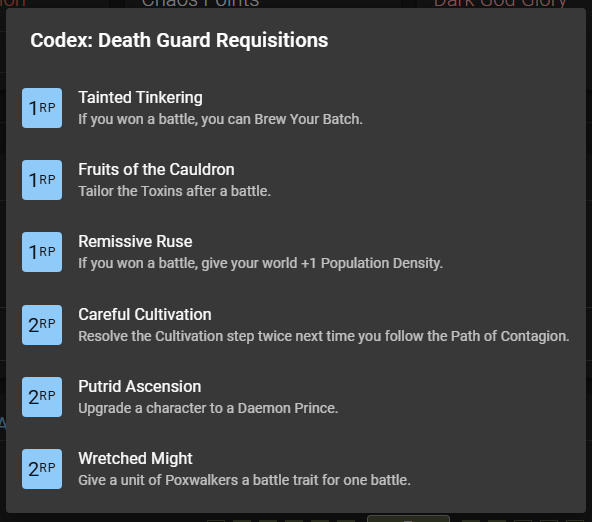 - We've added support for a number of Requisitions actually doing something across different books, aside from just incrementing/decrementing your RP.
