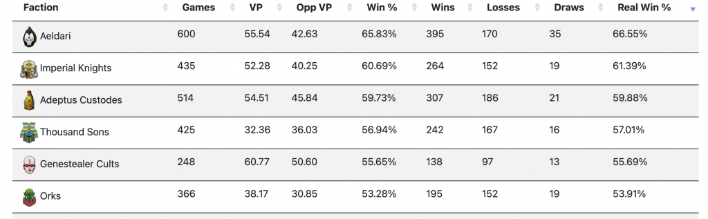 Finally, we have TiWP - Tournaments in Winning Position - and TiWP Ratio, which are the type of sabermetrics-looking thing you’d see in Baseball Prospectus. This is a more complex statistic, and describes how many times a given faction was in position to win a GT or larger event. Think of these as your 4-1 or 5-0 players: they might not win the event overall, but going into the final round they hadn’t been mathematically eliminated yet. TiWP itself is fine, but it’s the combination of TiWP and games by faction that produces the fourth OK stat, TiWP ratio. This is the ratio of how widely represented an army is in the meta to how often they come up in TiWP. If a faction shows up in 10% of TiWPs despite only being only 5% of the field, the TiWP Ratio would be 2.0, and that army is probably a little too good. It also probably means the models are sold out and you’re about to see a lot of proxies or 3D-printed versions of them on the table, because they’re very good.