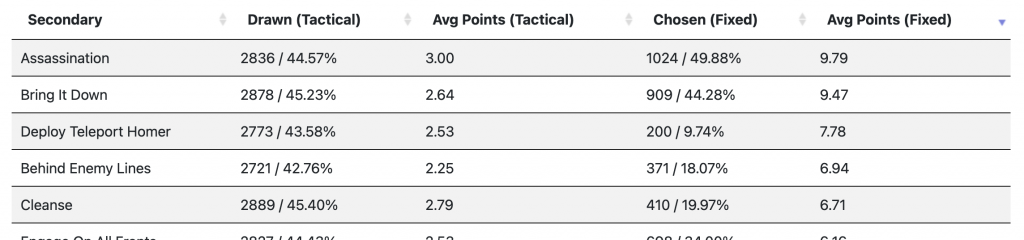 The third is points by secondary objective, both fixed and tactical. Knowing which secondaries tend to score better for your army can help you choose which to select in fixed mode, or which to discard when operating in tactical mode. Flip mode remains the greatest.