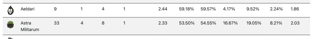 This image encapsulates every question I want 40kstats to answer: which of the two armies I own is The Good One this time around.