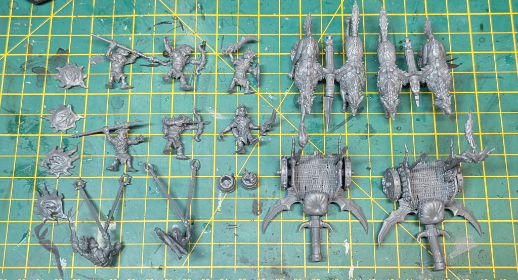 The bigger brothers of the existing Snarlfang Riders, the Snarlpack each carry two gitz on their back. Mercifully, these riders can all be built as single pieces and kept as subassemblies, and they all have pretty positive engagement with the saddles via the bone footrests and some carefully concealed connection points.