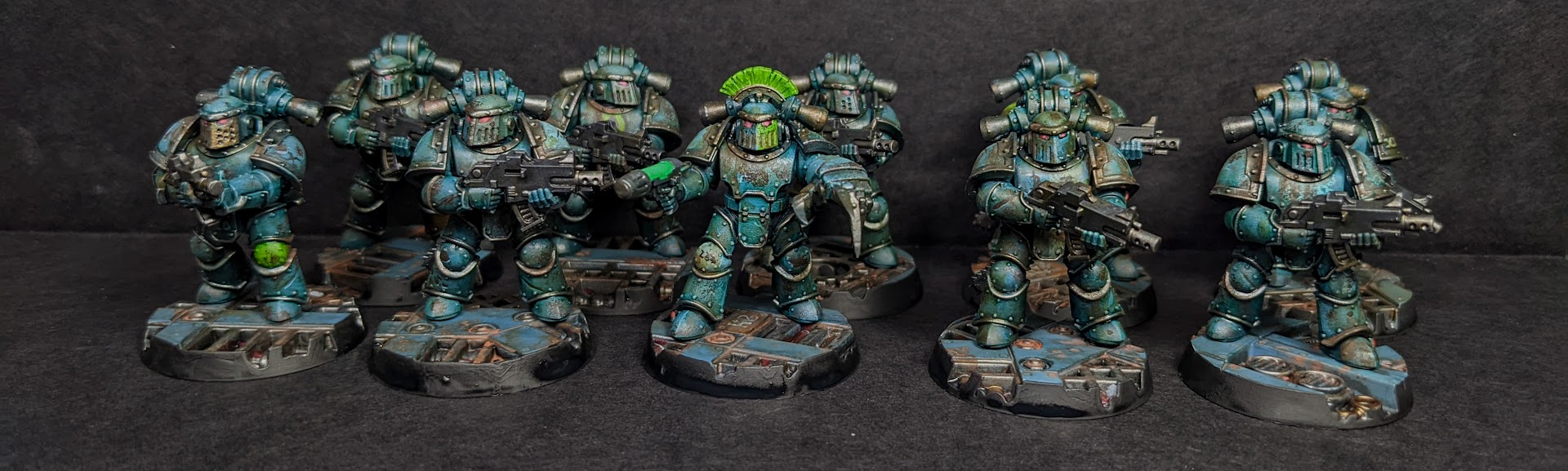 Enter my Alpha Legion force. Lacking the metallic sheen of some of the other units in the Horus Heresy, Insertion Force Κ9Λ (Kappa Nine Lambda) is a dedicated infiltration and sabotage unit focusing on ambushes, boarding actions and extended campaigns behind enemy lines. They only repair their armour to keep it functional, allowing the scrapes, burns and stains on their blue-green ceramite plates to provide natural camouflage. Veterans of dozens of operations, each marine has collected many individual markings and designations, though how many of them are meaningful to the unit as it currently operates is a mystery to outsiders. Though the unit has armoured assets, they are focused more on infantry as better suits their skill in close quarters battle and urban warfare.