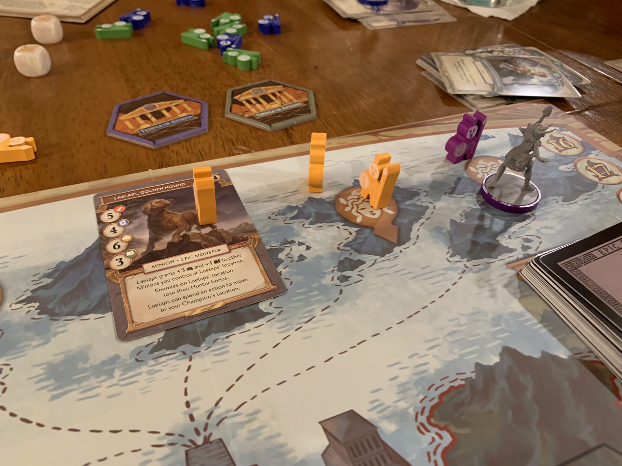 Kleos did not give in to the Kickstarter trope of producing a bespoke miniature for every card, token, and character but the use of generic numbered meeples makes understanding the board state a challenge.