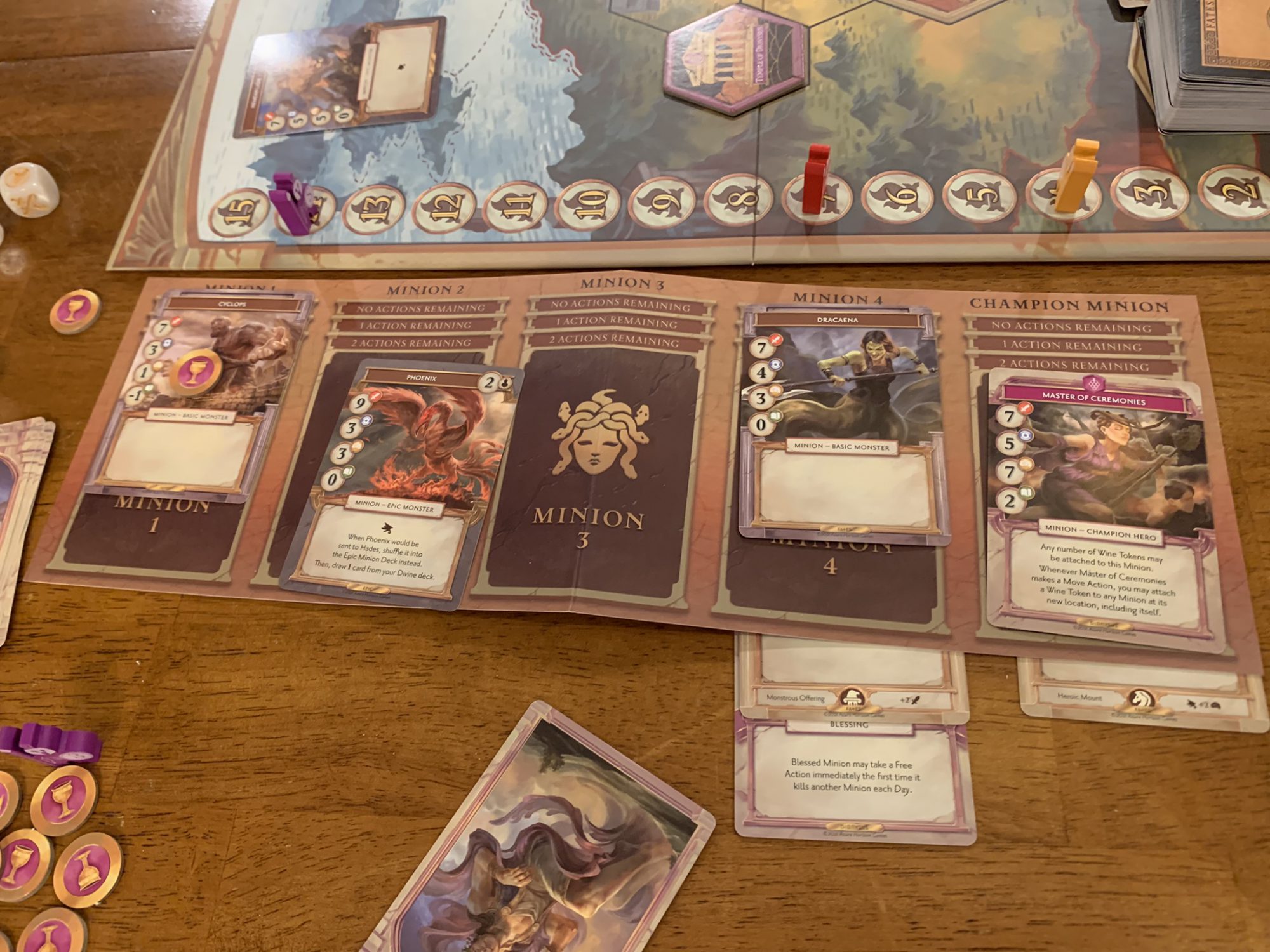 Each player has a player board that they play their cards to. Minions, Epic and normal, are represented by cards and all of the upgrades, boons, and curses are cards too. These are played to the player board as well. Each of the board's 5 slots has a corresponding numbered meeple but the stacks of cards make it nearly impossible to see who is what at a quick glance.