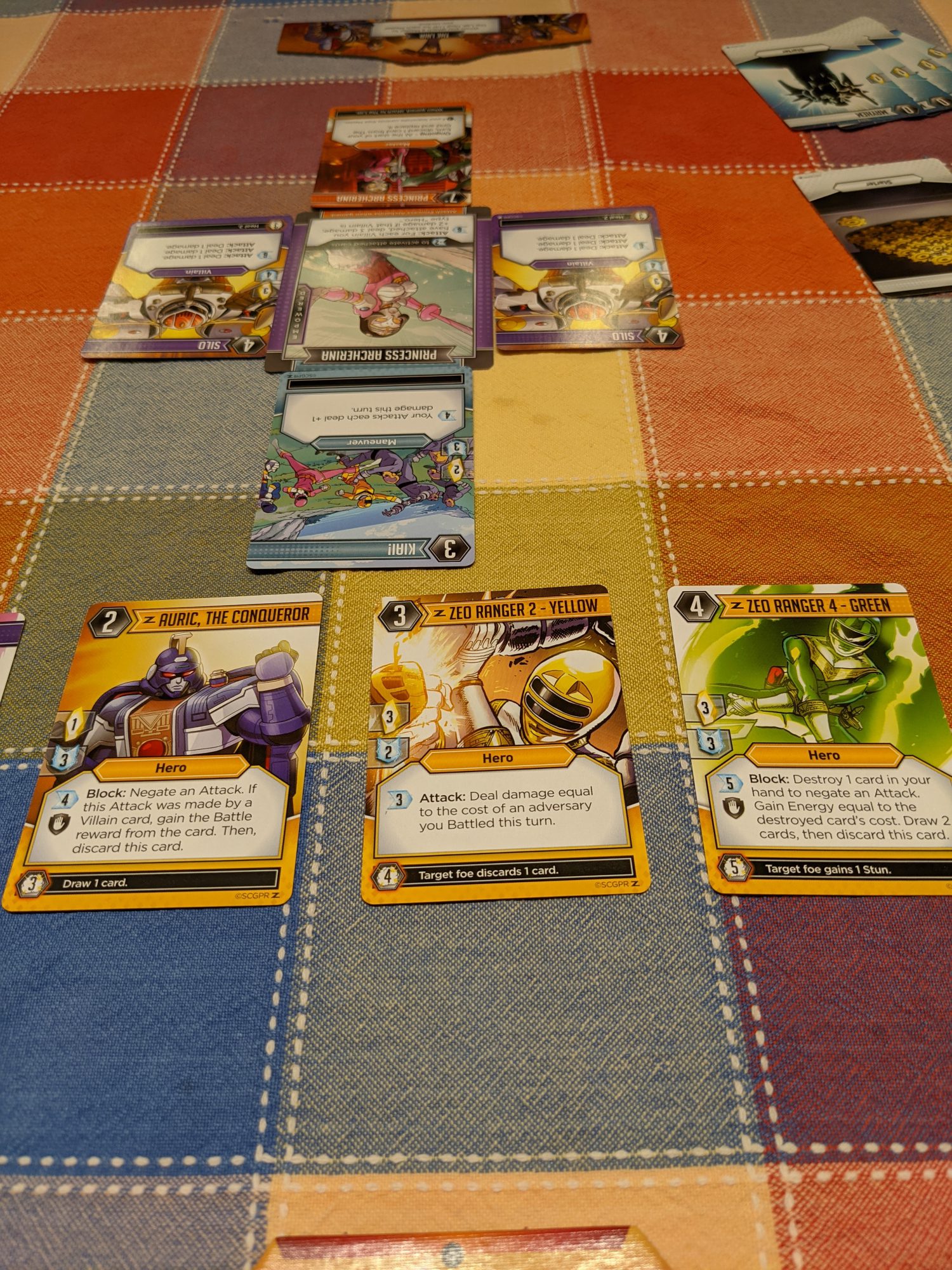 Power Rangers is played with sides: Heroes and Villains. It can be played with two or three players, but is very clearly intended to be a 4-player team-based 2v2 game. Though the team names differ, the gameplay and structure are almost identical. There is a center row consisting of different types of cards that both teams will use shards (the money-like currency in the game) to buy. Cards come in different colors that can be attached to the matching “slot” on your character card. Once you have attached cards to all four slots, your character flips and you get either a Zord for your ranger or the villain-equivalent Master card.