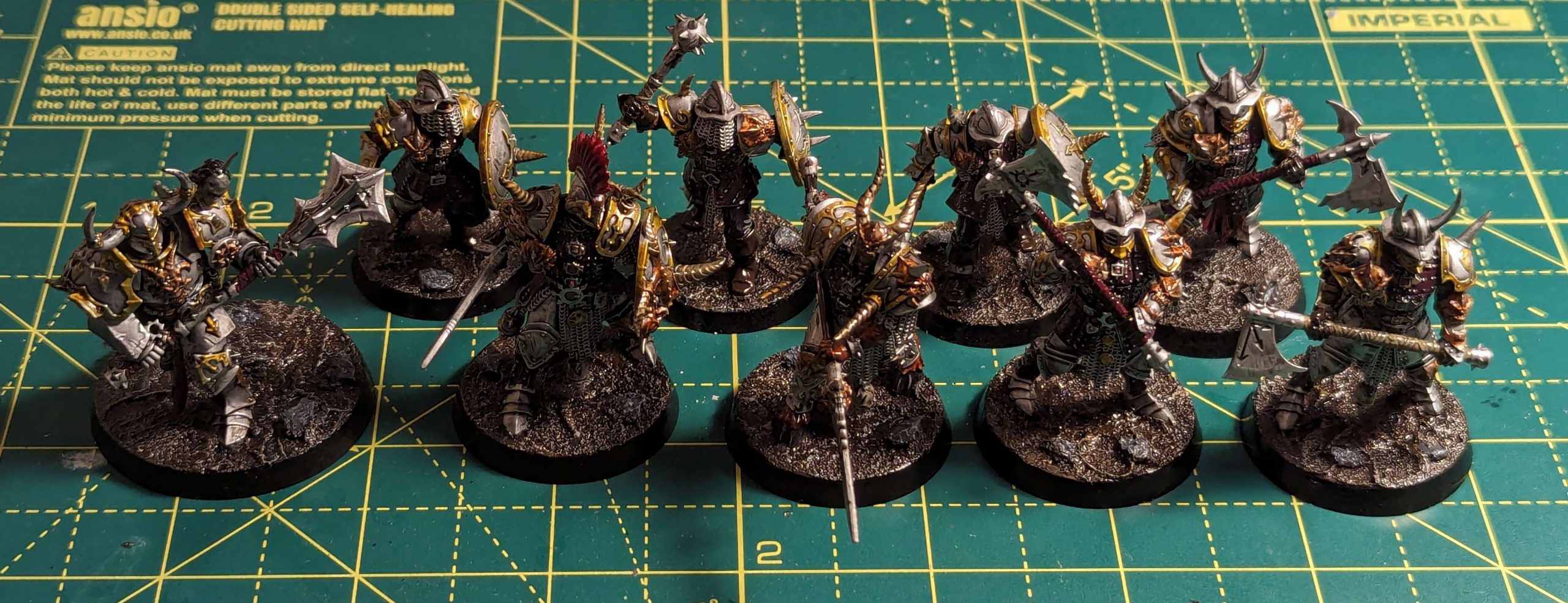 The Chaos Legionaries were mostly armour and trim, with the most difficult part being the neat painting of the brigadine armour. The hornshields and hornhelms are excellent models, and really suit being used as armoured chaos thugs well. I painted up a Chosen to use alongside them as a Chaos Warrior, giving a modern Chaos warrior to be the centre of a warband and tower over the normal human sized models.