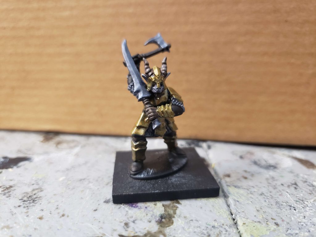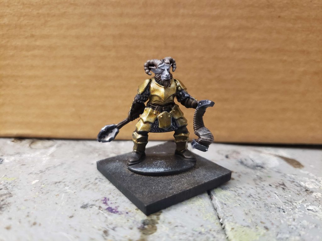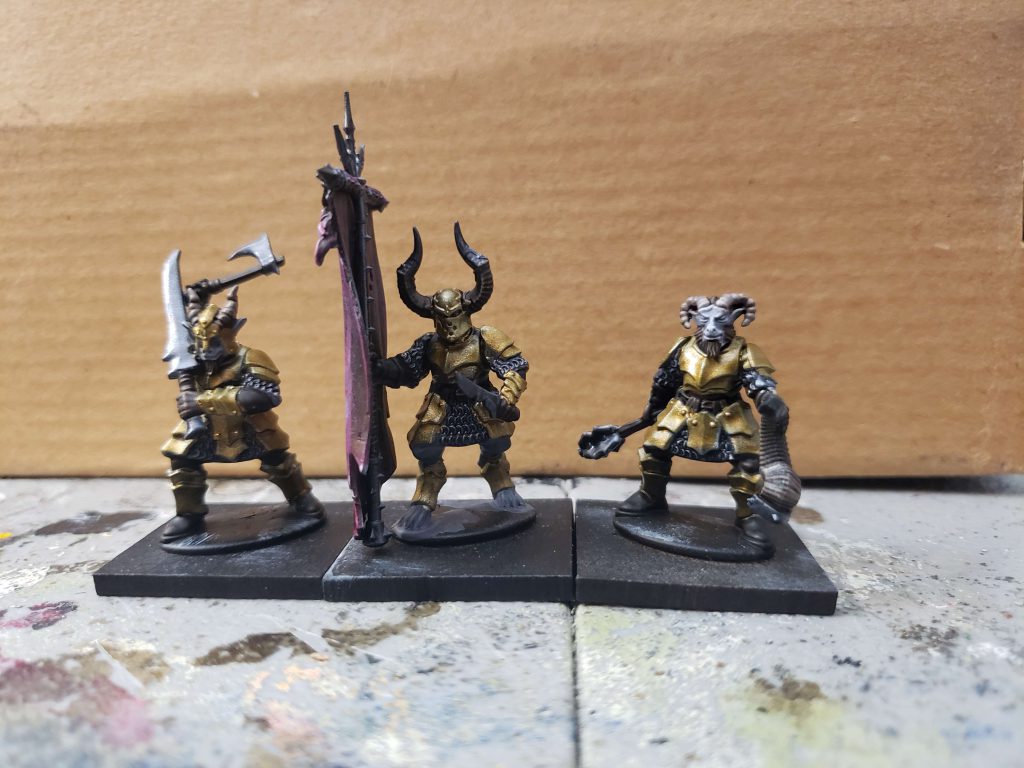 I have been having a lot of trouble getting my hands on Beastmen models locally; AOS isn't a big game here and everything seems to be out of stock every time I have money. The other day while poking around in my unbuilt models, I found a box of Frostgrave Demons that I had bought about a year ago and had been intending to use for a project that I never got around to. A look at the box and the sprues inside revealed that they would make fantastic Bestigors. I also found an old Reaper Pathfinder mini that I had bought ages ago, I believe this guy is a Pactmaster of Katapesh but he looks like a fantastic Shaman to me. My lore concept for this army is that a Tilean noble court fell under the sway of Chaos and were cursed to become Beastmen, and as such are used to a nicer life and better things than most Beastmen. My idea is that they are, in true Tilean tradition, mercenary scumlords that sign up with Warriors of Chaos, Chaos Dwarfs, and other evil/amoral factions for riches and wine. The golden bronze armor came from my urge to use one of the new Speedpaints, this one being Hoplite Gold over a black to white gradient undercoat. Really a huge fan of the Speedpaint metallics, some of the best metallic paints I have ever used.