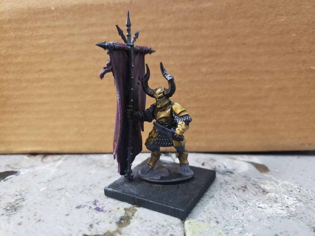 The standard bearer has a head from the new Chaos Chosen kit, for variety, and a banner made mostly of a spare banner from that kit. I picked it up a while ago to get started with AOS and it is a really good source of bits for Chaos conversions and projects.