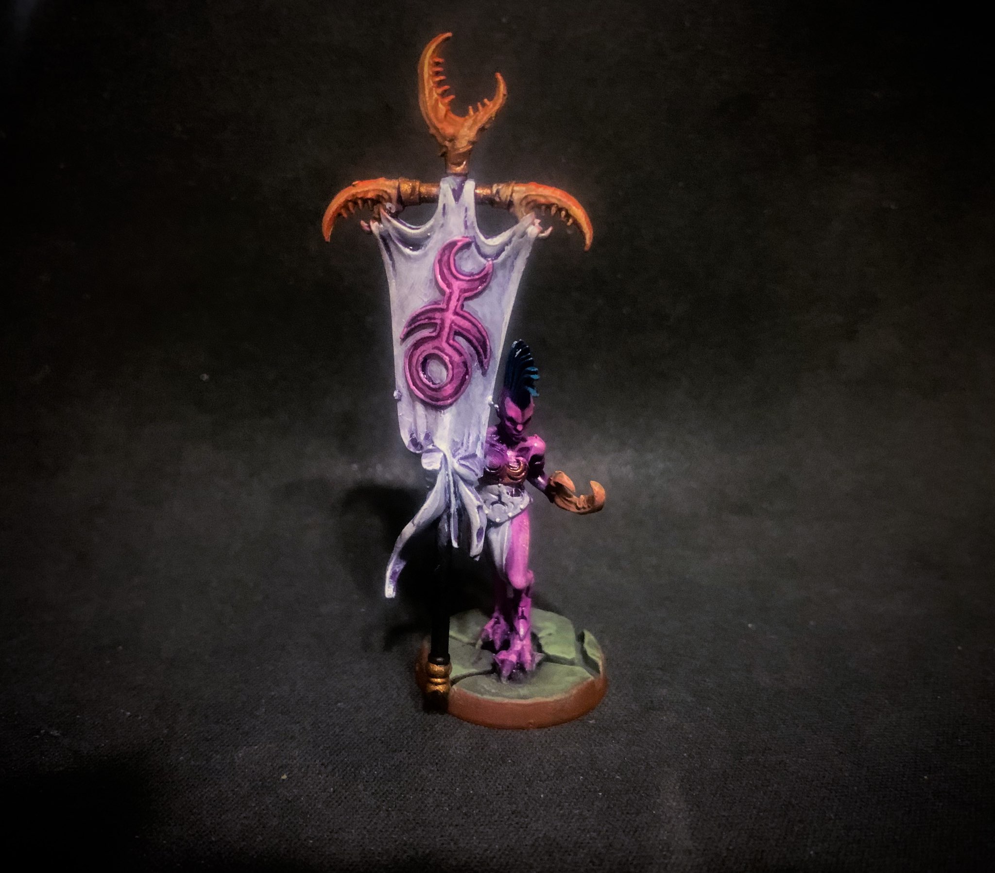 Slaanesh reclaimed their Champion with Sigvald returned, and Sigvald began preparations to declare war on the mortal realms. His previous sword, forged from a fragment of Slaanesh's own sword, would no longer be suitable. Since Slaanesh's demise, many pretenders have claimed to wield their own weapon that they claim comes from Slaanesh's own sword. He instead ventured into the Palace of Pleasure, Slaanesh's Realm, and had the forgemaster create a new sword worthy of his beauty. He named it Shardlash, and has begun a military campaign against the one who injured him in the first place, Nagash. Since then he has rallied cultists from across the Free Cities to take the fight directly to Nagash, only making temporary stops to destroy a settlement of Deathrattle or Nighthaunts. Sigvald's rage will not be denied, for his anger is only matched by his beauty.