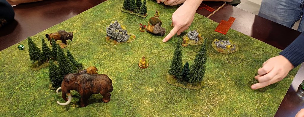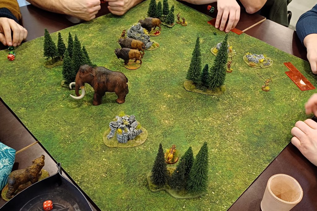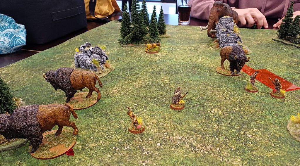 Much like the game, what you need to play is fairly simple. although you may need to source some appropriate hunters. North Star figures has a nice range from Lucid Eye and their Savage Core range, and Steve Barber Models has some nice beasties as well as a fishing coracle! I haven’t really checked out 3d printing ranges, but I bet there’s some stuff out there. For beasts, I used dollar store bison which looked suitable enough after a quick paint job, and found a toy mammoth online. Since I already had some woodland scenery, the total cost of the project was about £40/$50/€46, rules included. I think that toy mammoth was the most expensive thing. A fun little side project which you can knock out in an afternoon or two. The suggested playing area is 3x3, although a 4x4 might be a bit better for larger scenarios. This is pretty easy to fill up with some woodland scenery, and you don’t need that much, grazers need some space to graze of course.