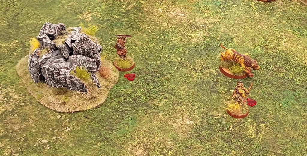 Simply rushing in and trying to move fast will make your hunters go on a jolly little romp around the local scenery. Teamwork is of the essence and a good hunter will know when to sneak and when to run. This friction works great in co-op with multiple players, as people will have to work together to avoid starvation. You can also use doggies if you want! Hounds can assist you and are more or less under control of the player. They are still pretty wild, so on a failed activation roll they won’t necessarily attract attention as a hominid face planting in the brush, but return to their master or go after wounded prey. You can premeasure at all times, and like the stats, you only have three simple range bands to remember: short, medium and long, which roughly translates to 3, 5 and 7 inches at 28mm.