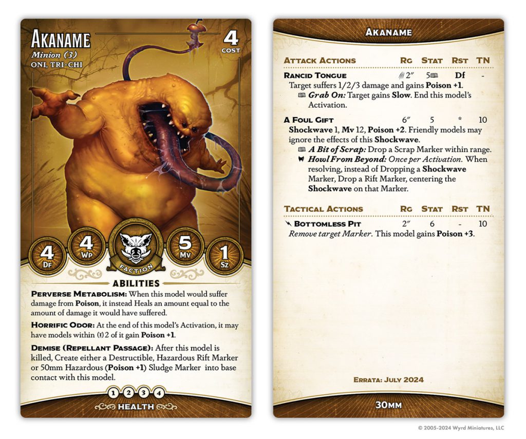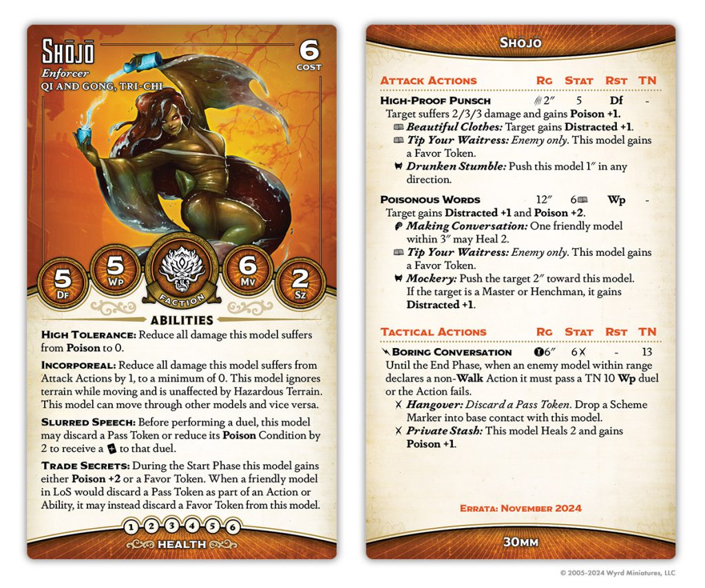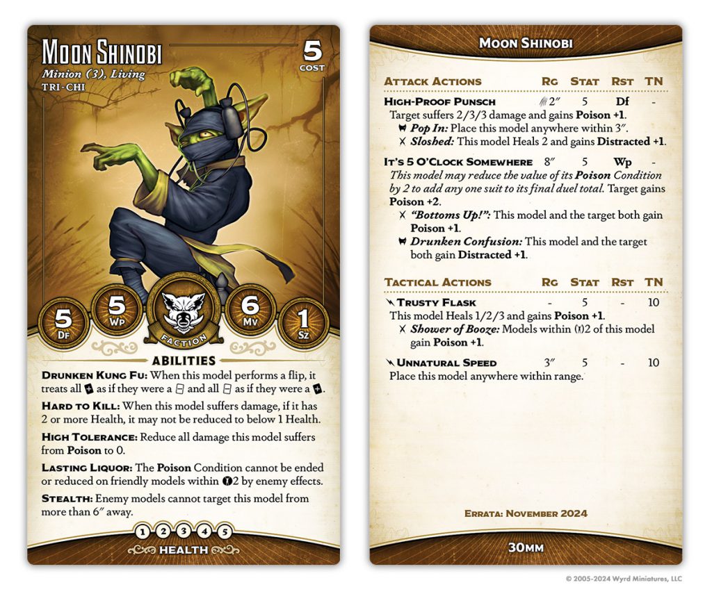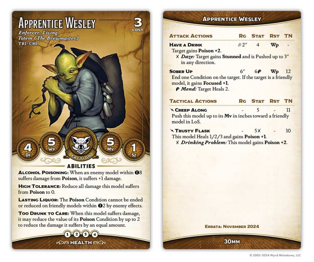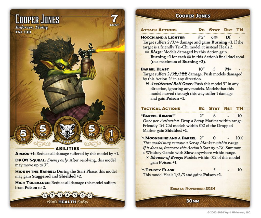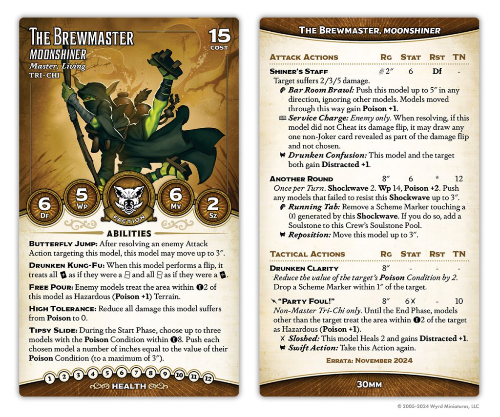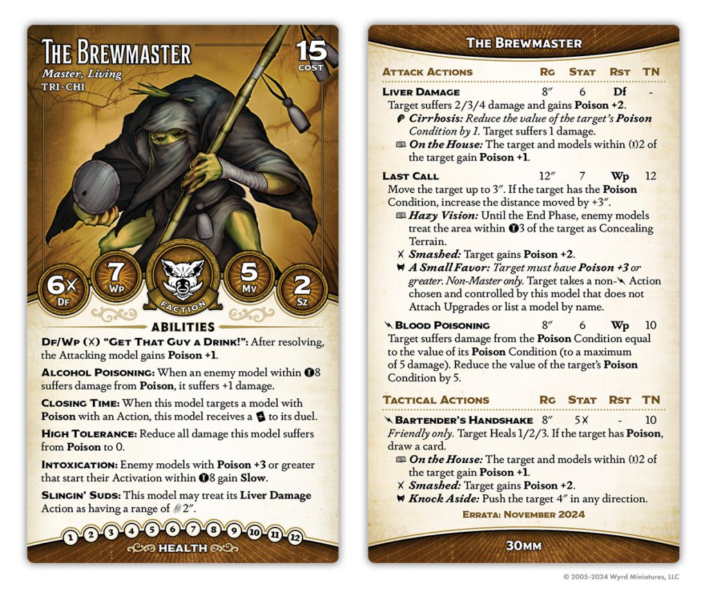 He's gained a point of health, but lost Lasting Liquor and Bar Room Brawl. His Tipsy Slide has been normalized a bit - now it pushes equal to the total of the pushed model's Poison condition, but caps out at 3. He's also gained Free Pour, a neat always-on Hazardous (Poison) aura, although this one only affects enemies.