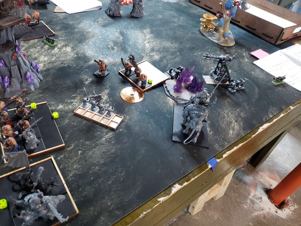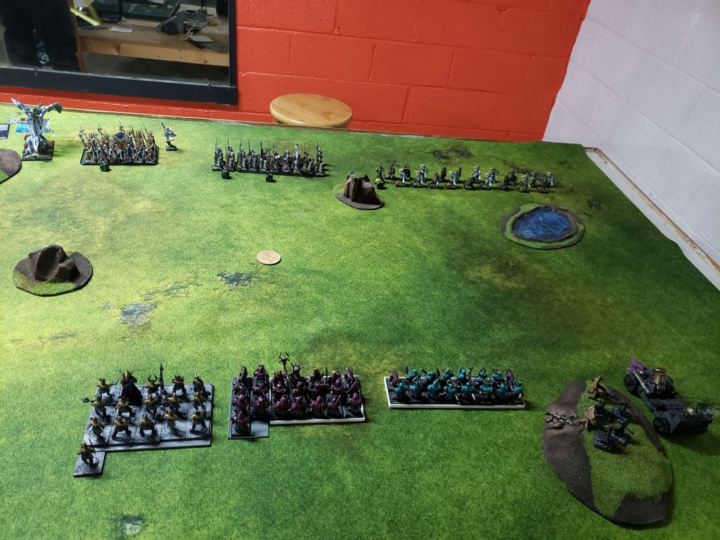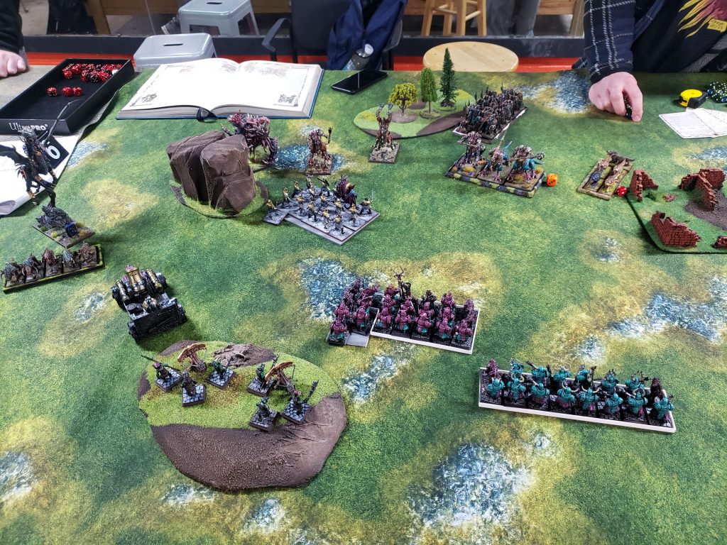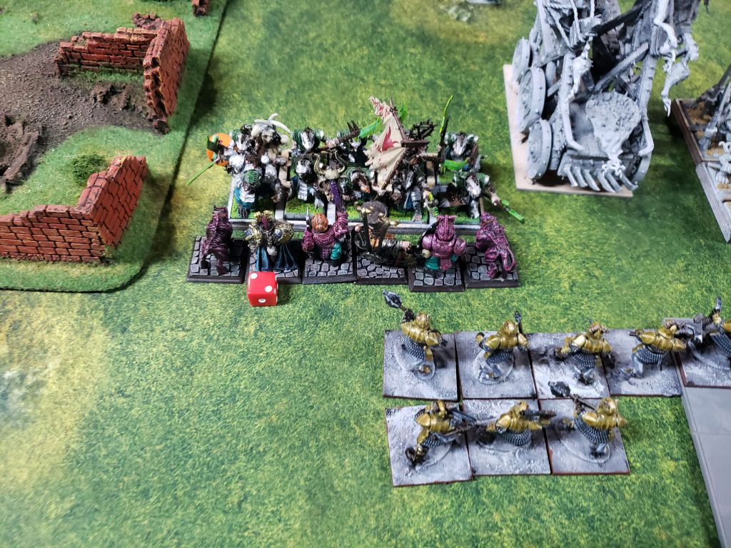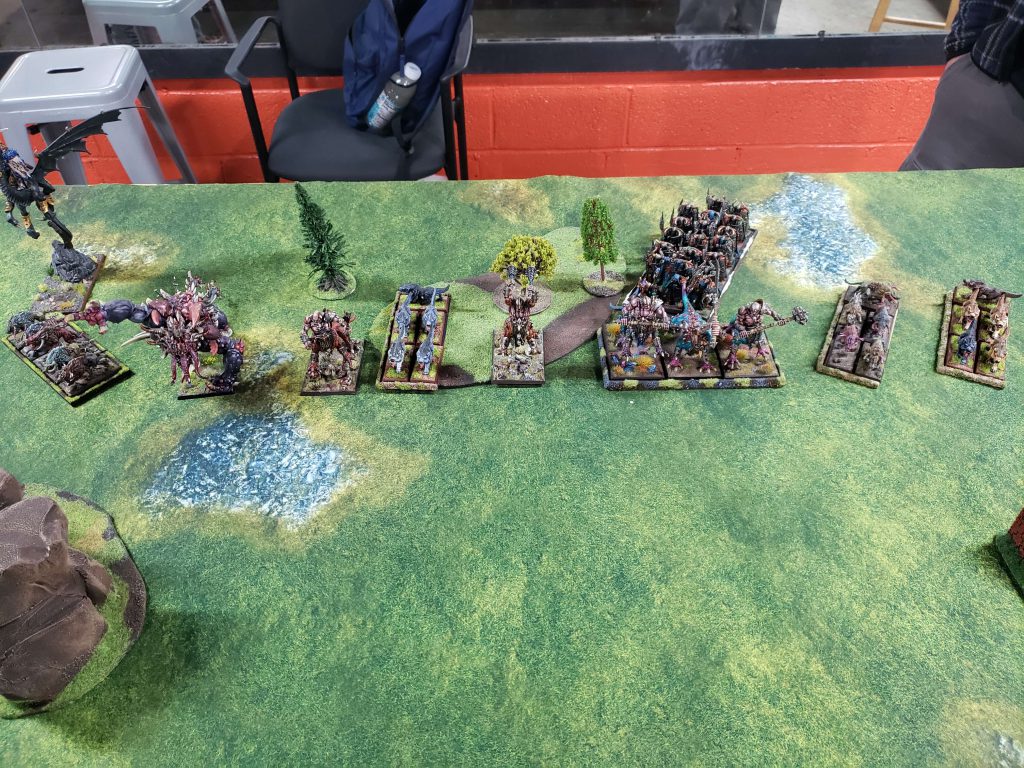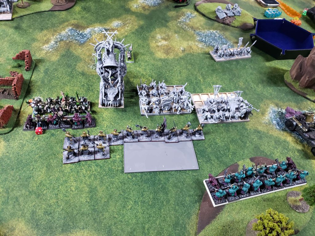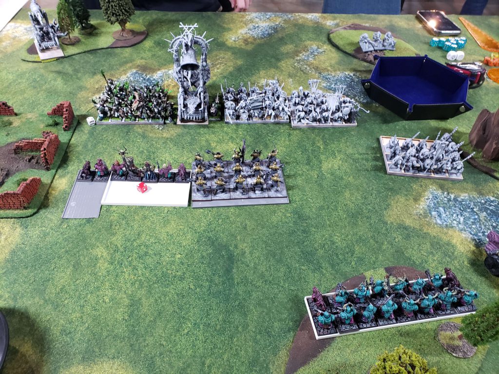 I ended up taking a lot of heavy infantry. I knew when I was submitting the list that it was suboptimal, Chorfs really want Bull Centaurs and Wolf Riders to give them some mobility and agency in games, and some cheapo Hobgoblin archers to deal with chaos warhounds and other super fast bastard units. I was counting on stat-checking people with the insanely powerful brick of Ironsworn by stacking Daemonology buffs on them to make them insanely high damage and hard to kill.