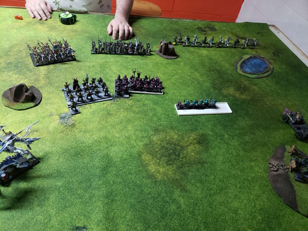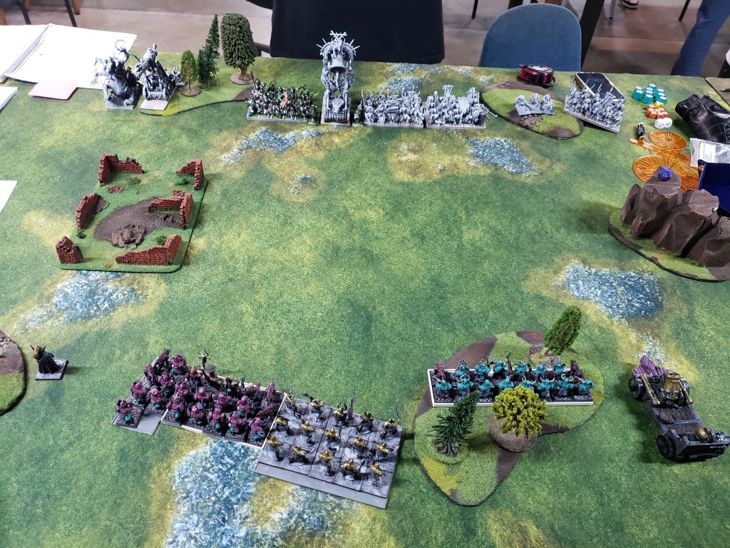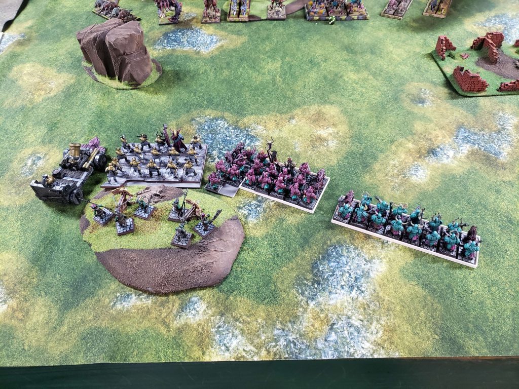 I deployed a little weirdly because I badly didn't want to get stuck in the woods with my Blorcs or in the ruins with my Ironsworn. My Hobgoblin bolt throwers are just out of frame on another deployment zone hill. I decided this game to deploy my Blorc warboss alone to go try to duel his Hellpit abomination because god damn it I want to use this stupid 50 point sword and have it do something at least once this game.