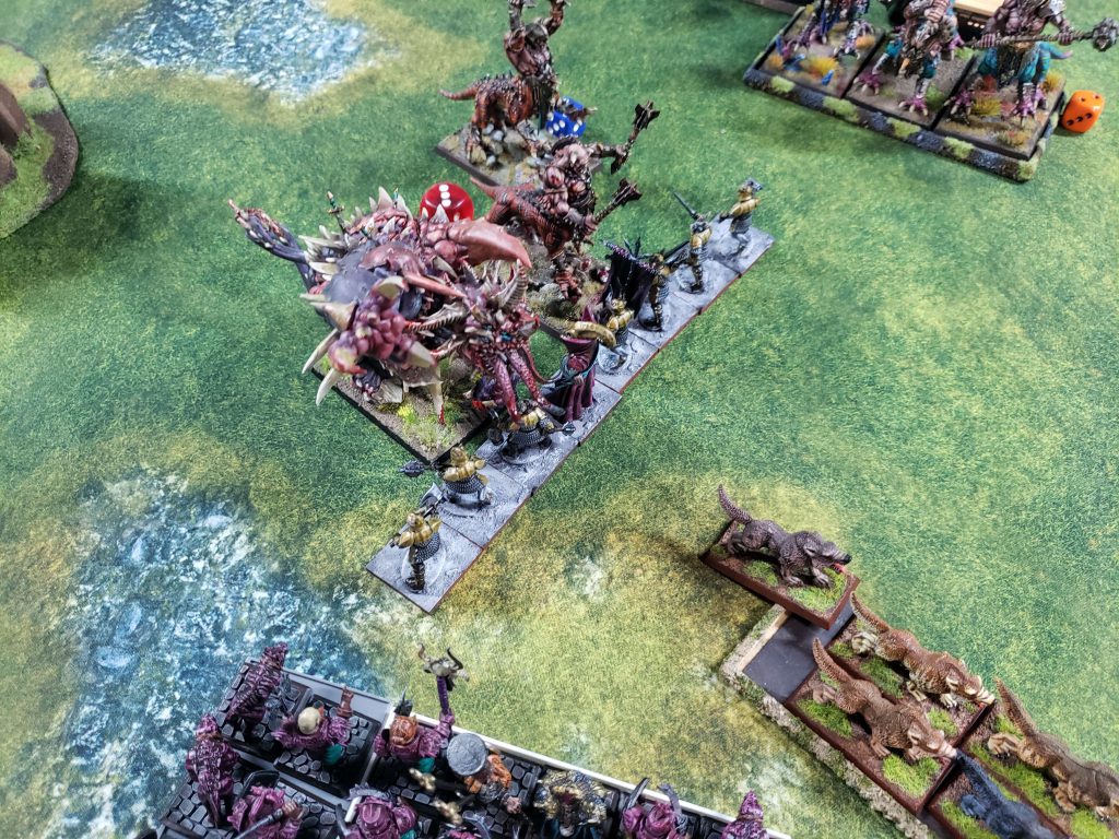 After shoving the Stormvermin off the table, my Ironsworn, reduced to 5 models, flank charged his Grey Seer and broke him in combat, leading to him fleeing through his own troops and somehow not panicking them. They smacked into the flank of his Clan Rats and the Hellpit came back from eating my bolt throwers to remind me it was still on the table.