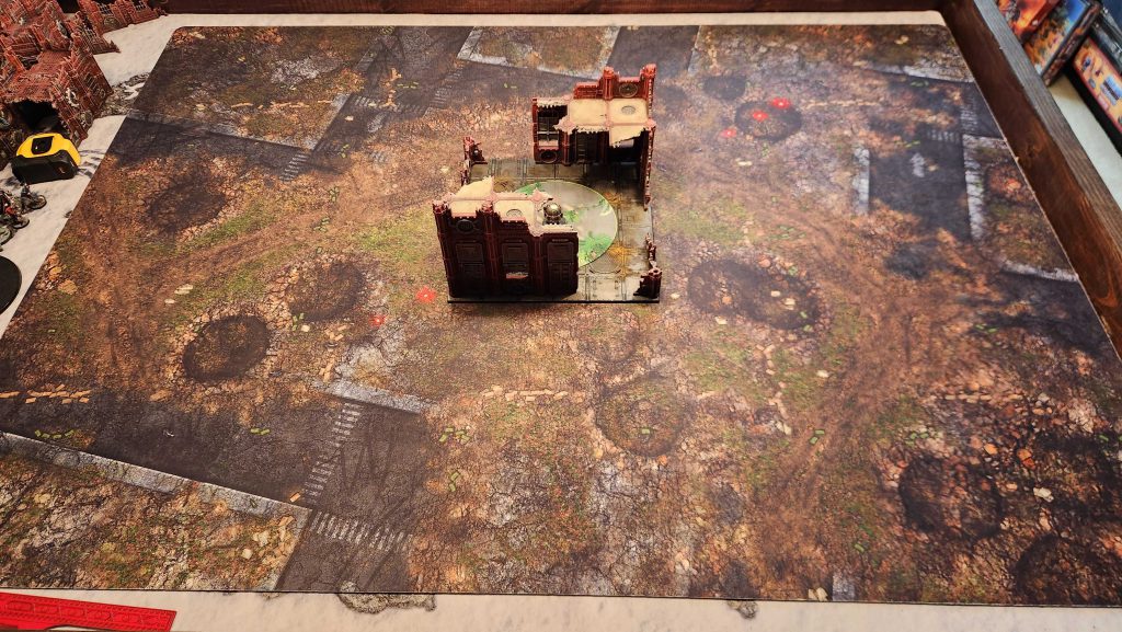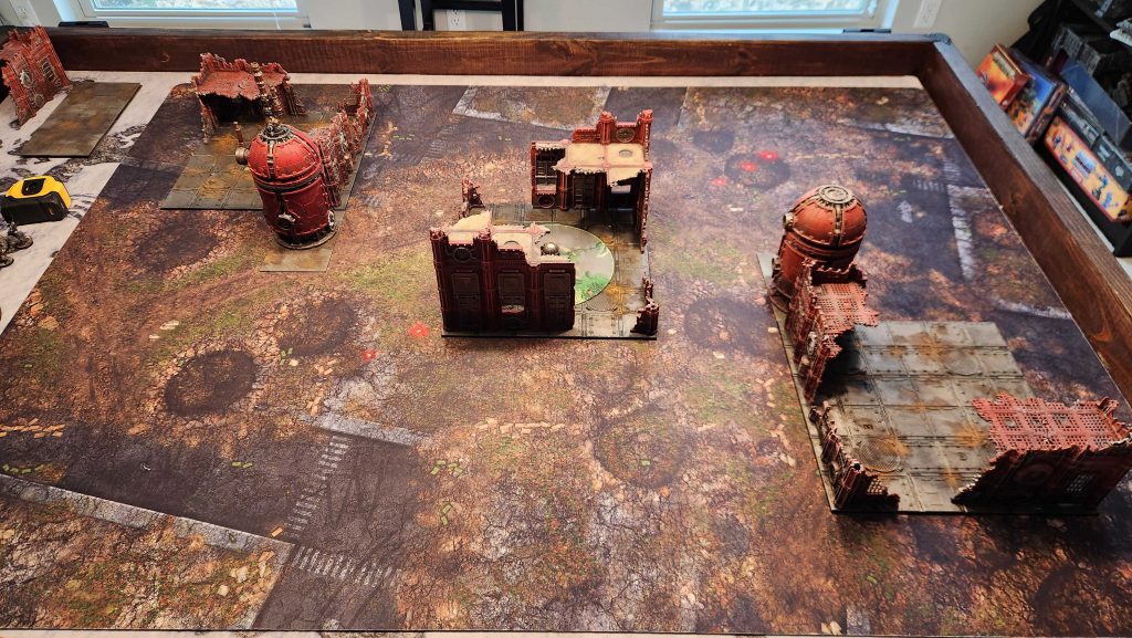 Let's Start with that No Man's Land setup. We've got one objective in the middle of the table players are going to fight over. I've got a mix of different terrain base sizes here but for this one I wanted to go with a Sector Mechanicus, and the best bases I have for that are the Necromunda tiles, which give me a set of 12"x12" bases to work with.