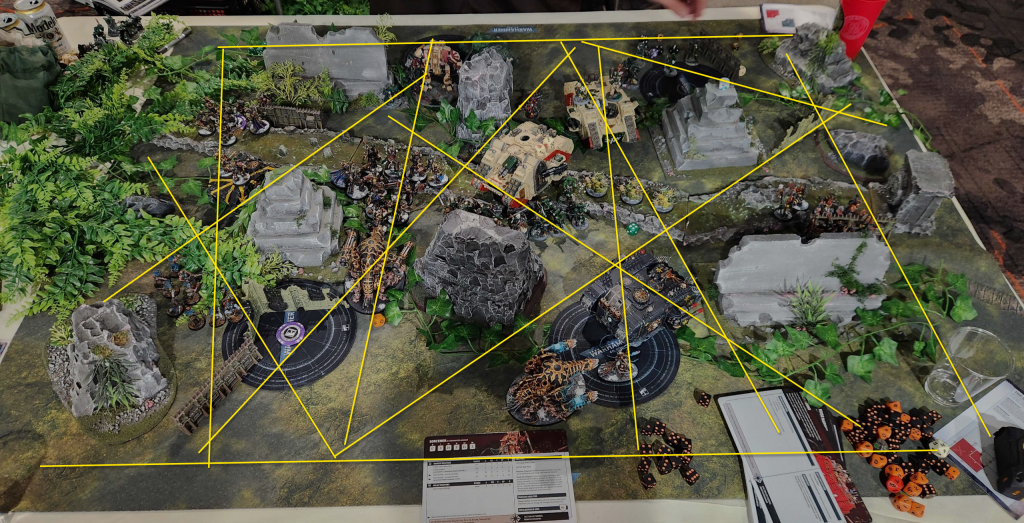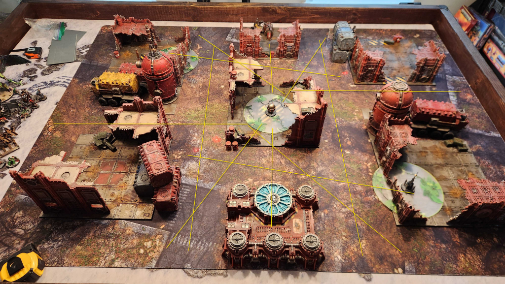 This solves that problem a bit better - models are still vulnerable in the middle of the table but the sightlines across the table aren't super accessible. This wouldn't work super well for Dawn of War or Sweeping Engagement but should be OK for every other deployment map. The only table-length sightlines here are down the short side, and I largely don't care about the ones in deployment zones if there are no home objectives to worry about. The rest are pretty short, capping out around 30".