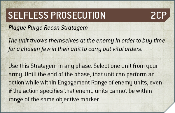 Selfless Prosecution (2 CP) is one I’ll probably need to tattoo to the back of my hand. It allows you to perform an action while within engagement range of the enemy even if it would normally fail.